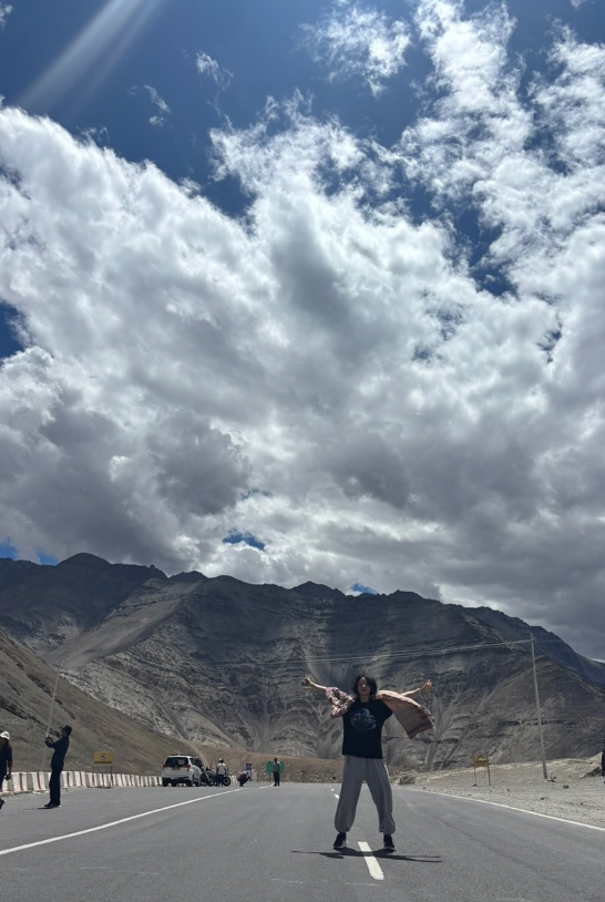 사진 속 하니는 운동화도 아닌 슬리퍼에 편안한 트레이닝복 차림으로 황량하고 거대한 산악지형 위에 서 있다. 머리 위로 구름이 휘몰아치는 하늘, 발아래 펼쳐진 암갈색 대지, 아찔한 산악 도로, 그리고 스티커가 가득 붙은 푸드트럭 앞의 하니. 모든 장면은 여느 여행과는 결이 다른, 라다크 특유의 분위기를 그대로 담고 있다.