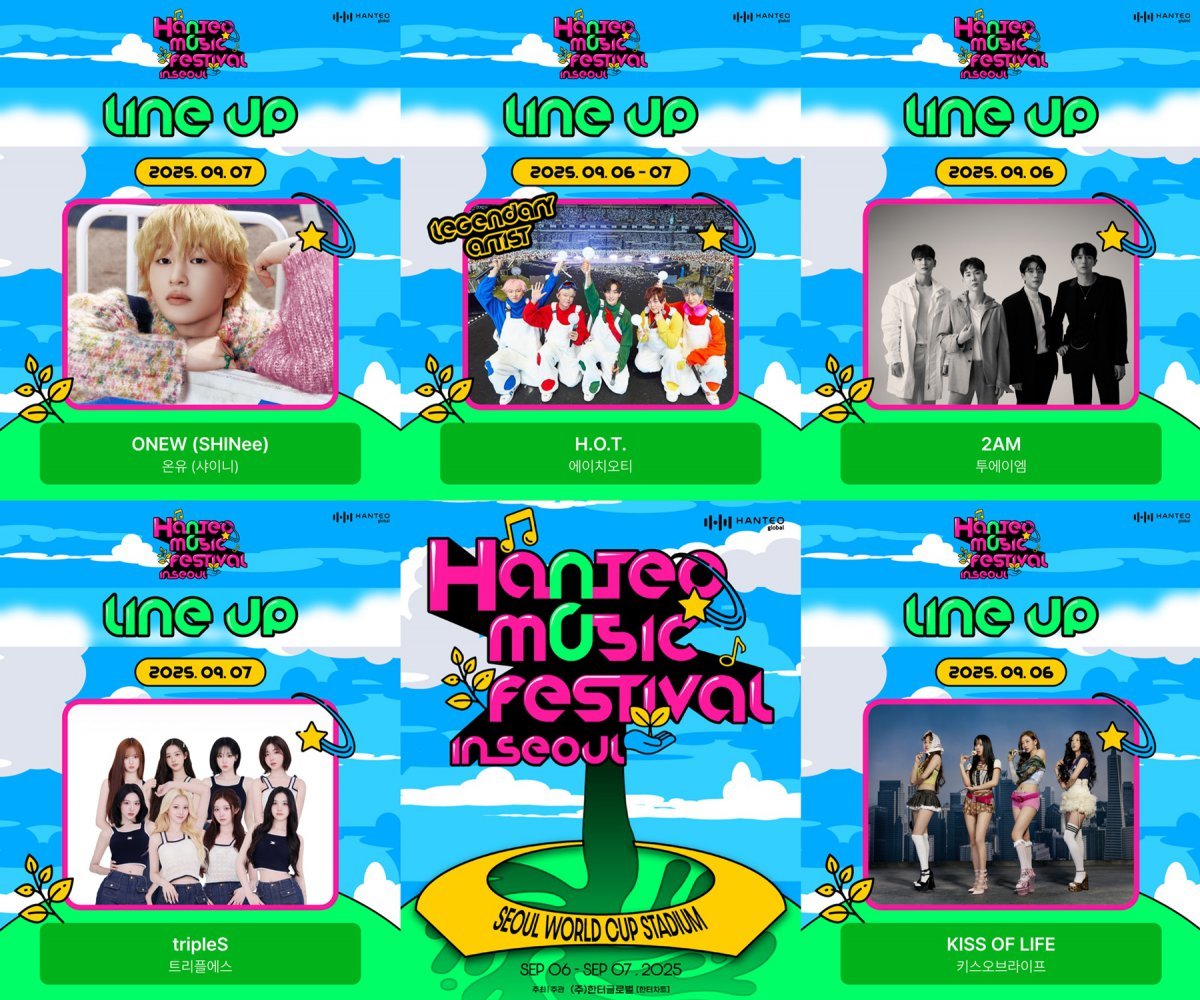 ‘한터 음악 페스티벌’(Hanteo Music Festival, 이하 ‘한음페’)을 주관하고 주최하는 한터글로벌은 8일 ‘한음페’ 공식 홈페이지와 SNS를 통해 1차 라인업을 공개했다. 이에 따르면 헤드라이너인 H.O.T.를 필두로 2AM 완전체, 샤이니 온유, 키스오브라이프, 트리플에스가 이름을 올렸다.