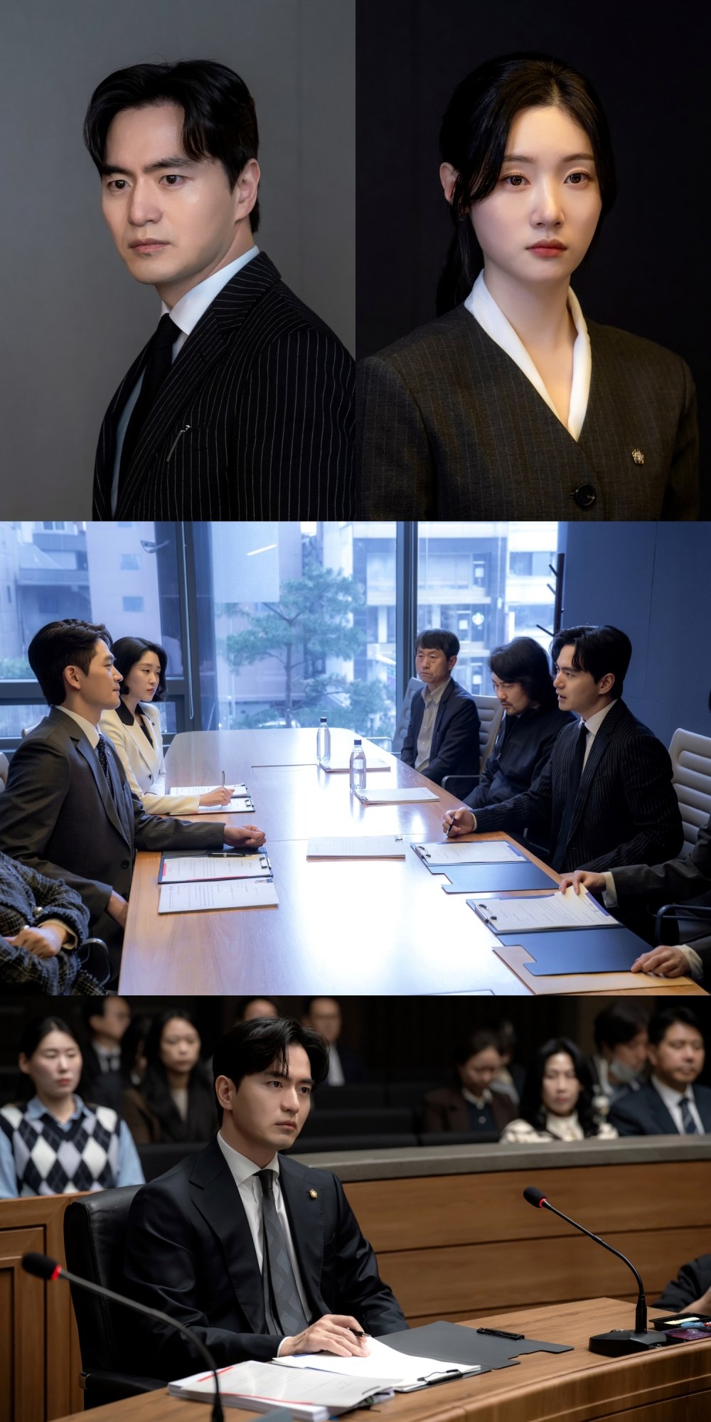 공개된 사진 속에는 일순간 음주 운전에 교통사고범이 된 의뢰인을 변호하게 된 윤석훈과 강효민의 모습이 눈길을 사로잡는다. 다친 사람은 있으나 정작 피해자를 차로 친 사람은 없는 황당한 사건 앞에 놓인 두 사람이 고군분투를 벌이는 것.