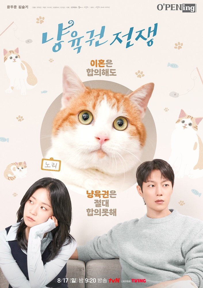 오는 17일 일요일 밤 9시 20분에 방송되는 ‘냥육권 전쟁’(연출 유학찬/극본 지수희/기획 스튜디오드래곤/제작 지앤지프로덕션)은 이혼을 앞둔 부부가 같이 키우던 고양이의 양육권을 두고 아옹다옹 냥육권 전쟁을 그린 드라. 고양이에 대한 양육권, 이른바 냥육권을 쟁취하기 위해 다투는 달콤∙살벌한 로맨스로 예비 시청자의 흥미를 자극한다.