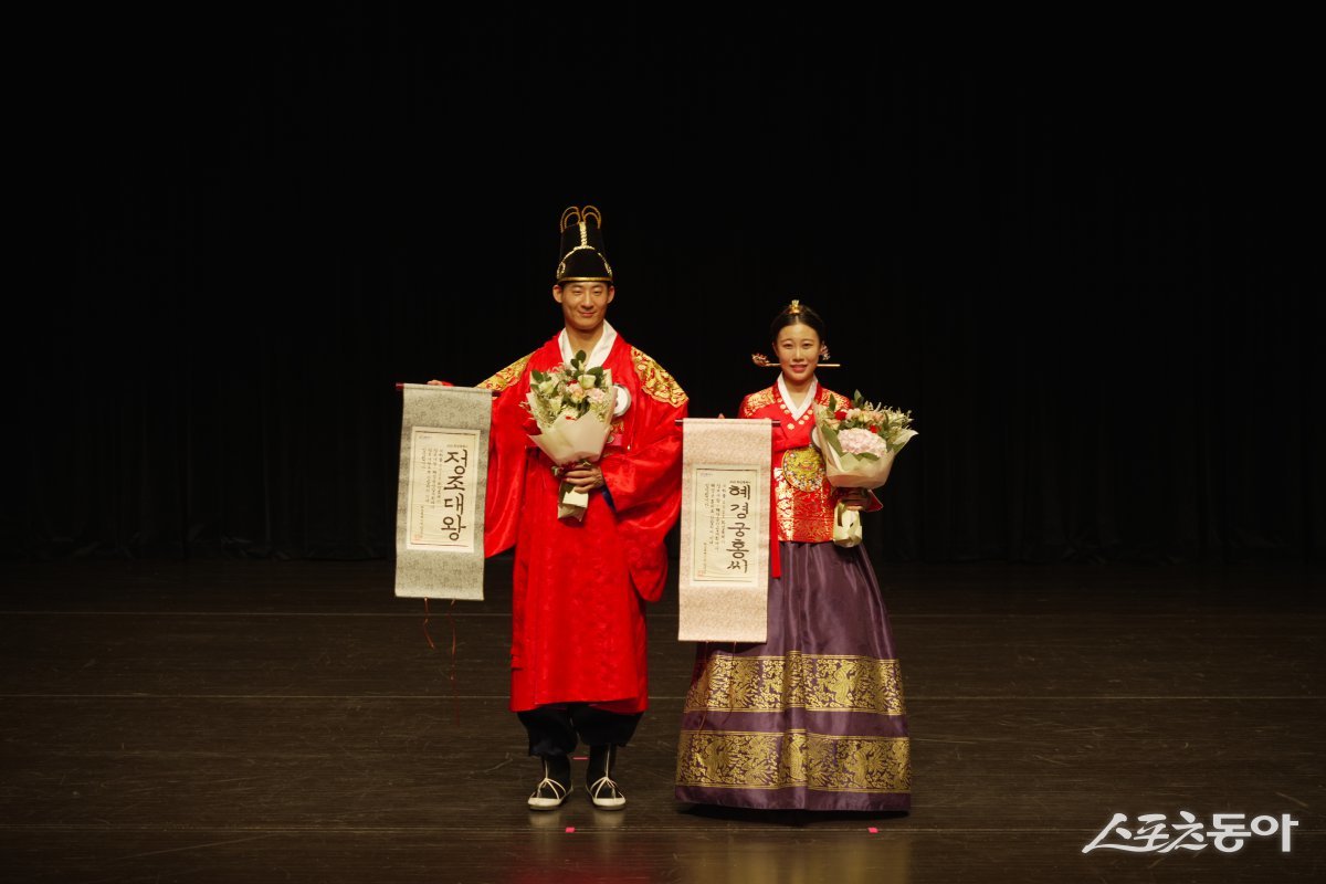정조대왕으로 선발된 김주한 님(반월동 근무)과 헤경궁 홍씨로 선발된 한예진 님(동탄5동 거주)이 선발 증서를 들고 기념촬영을 하고 있다. 사진제공|화성시