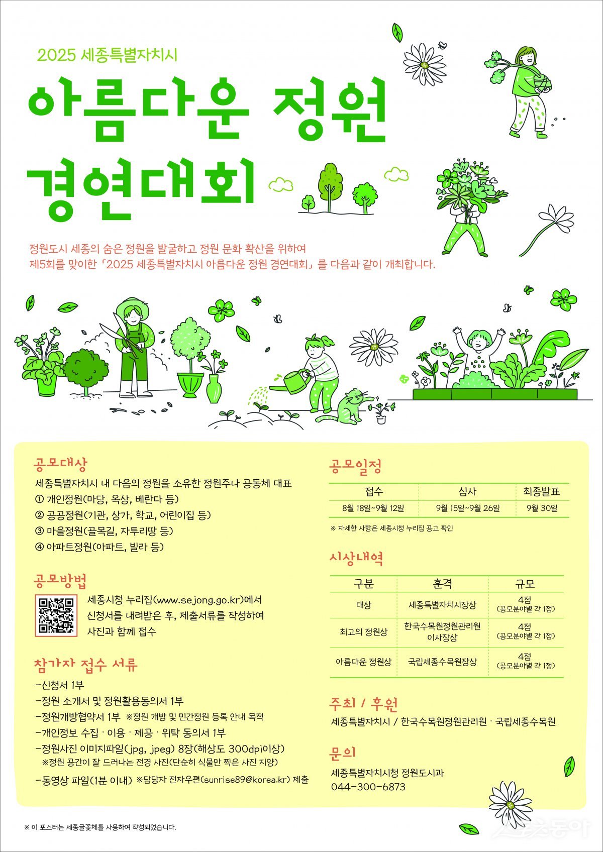 정원을 가꾸는 세종시민이라면 누구나 참여할 수 있다. 참가 신청은 8월 18일부터 9월 12일까지 시 누리집(www.sejong.go.kr)을 통해 가능하다.