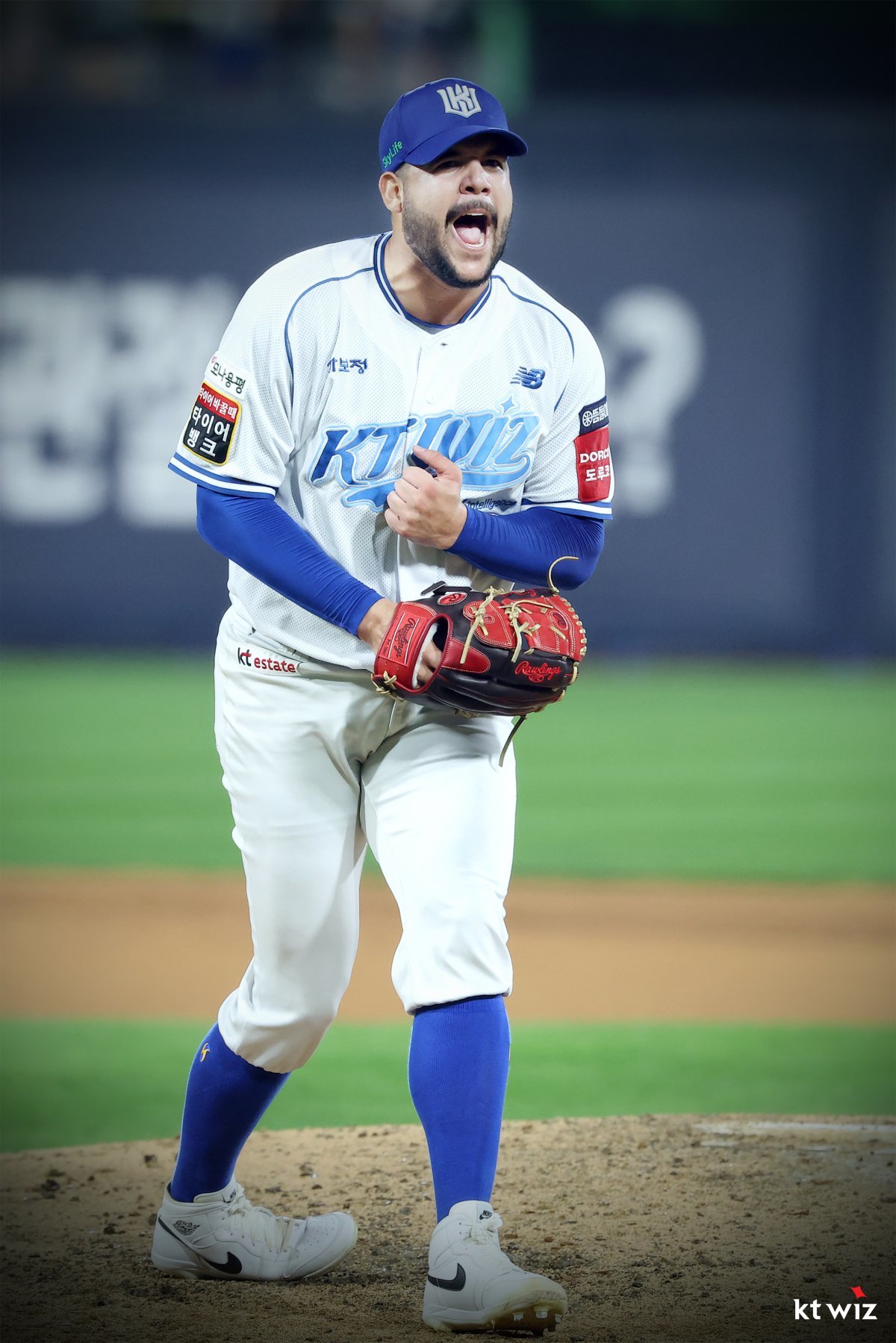 6연속 포스트시즌(PS) 진출을 노리는 KT에는 헤이수스의 활약이 절실하다. 최근에는 국내 에이스로 활약하던 소형준이 2년 전 수술한 팔꿈치 보호를 위해 선발에서 불펜으로 보직을 옮겼다. 선발진의 중심을 잡을 투수가 필요하다. 헤이수스도 책임감을 느낀다. 그는 “내 손에 공이 쥐어져 있을 땐 우리 팀이 이길 수 있게 최대한 많은 이닝을 던져야 한다는 생각이 강하다”며 “최근 들어선 우리 불펜에서도 피로를 많이 느끼고 있기 때문에 내가 더 많이 던지려고 노력한다”고 말했다.