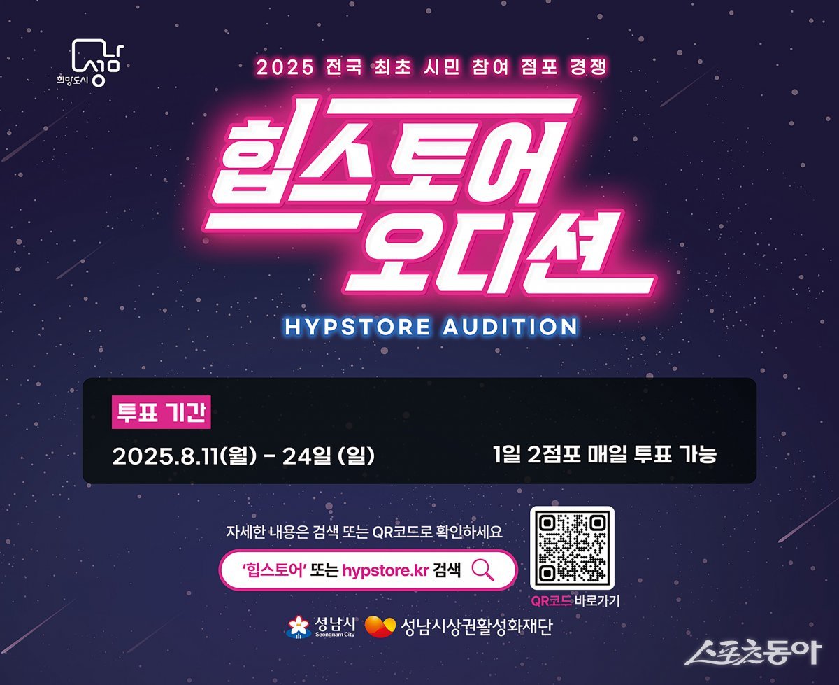성남시상권활성화재단(이사장 신상진)은 전국 최초 시민 참여형 점포 서바이벌 프로그램인 ‘2025 힙스토어(Hypstore) 오디션’ 시민투표를 8월 11일부터 24일까지 진행한다고 밝혔다.