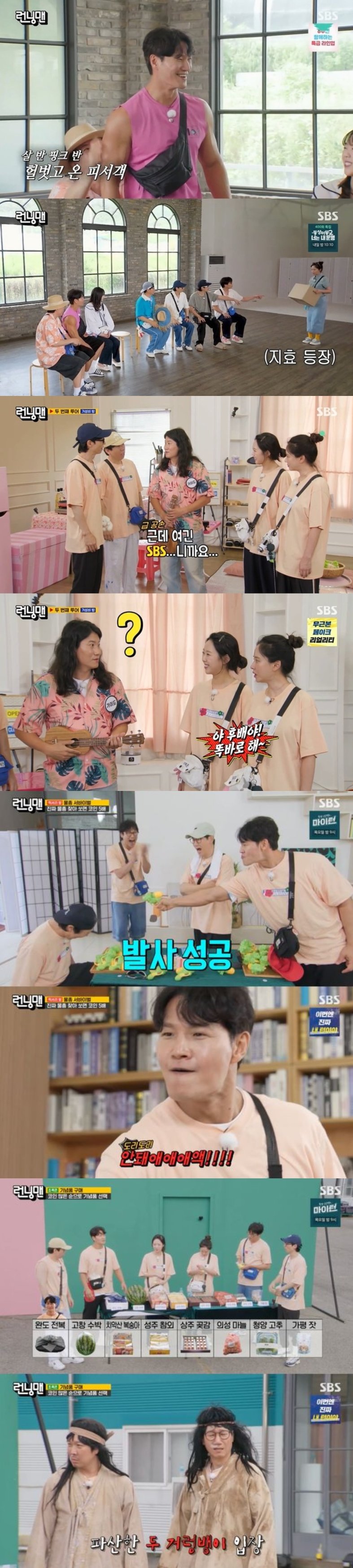 먼저 김종국은 성난 팔근육이 드러난 민소매 티셔츠를 입고 오는가 하면, 송지효는 배를 드러낸 청청 패션으로 멋을 뽐냈다. 송지효의 파격 패션에 김종국은 “자신이 많이 없었나 보다. 마이크로 배를 가렸다”라고 덧붙여 웃음을 자아냈다.
