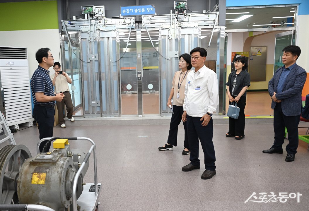 정종복 기장군수가 전문 인력 양성을 위한 승강기 교육 현장을 시찰하고 있다. (사진제공=기장군)