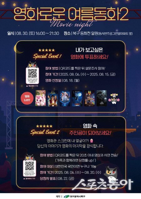 대구 북구청(청장 배광식)은 오는 8월 30일 오후 4시부터 동서변주공그린빌 옆 하천 둔치에서 ‘온 가족이 함께 즐길 수 있는 야외 영화관’을 주제로 한 찾아가는 문화공연 ‘영화로운 여름동화 2’를 개최한다.