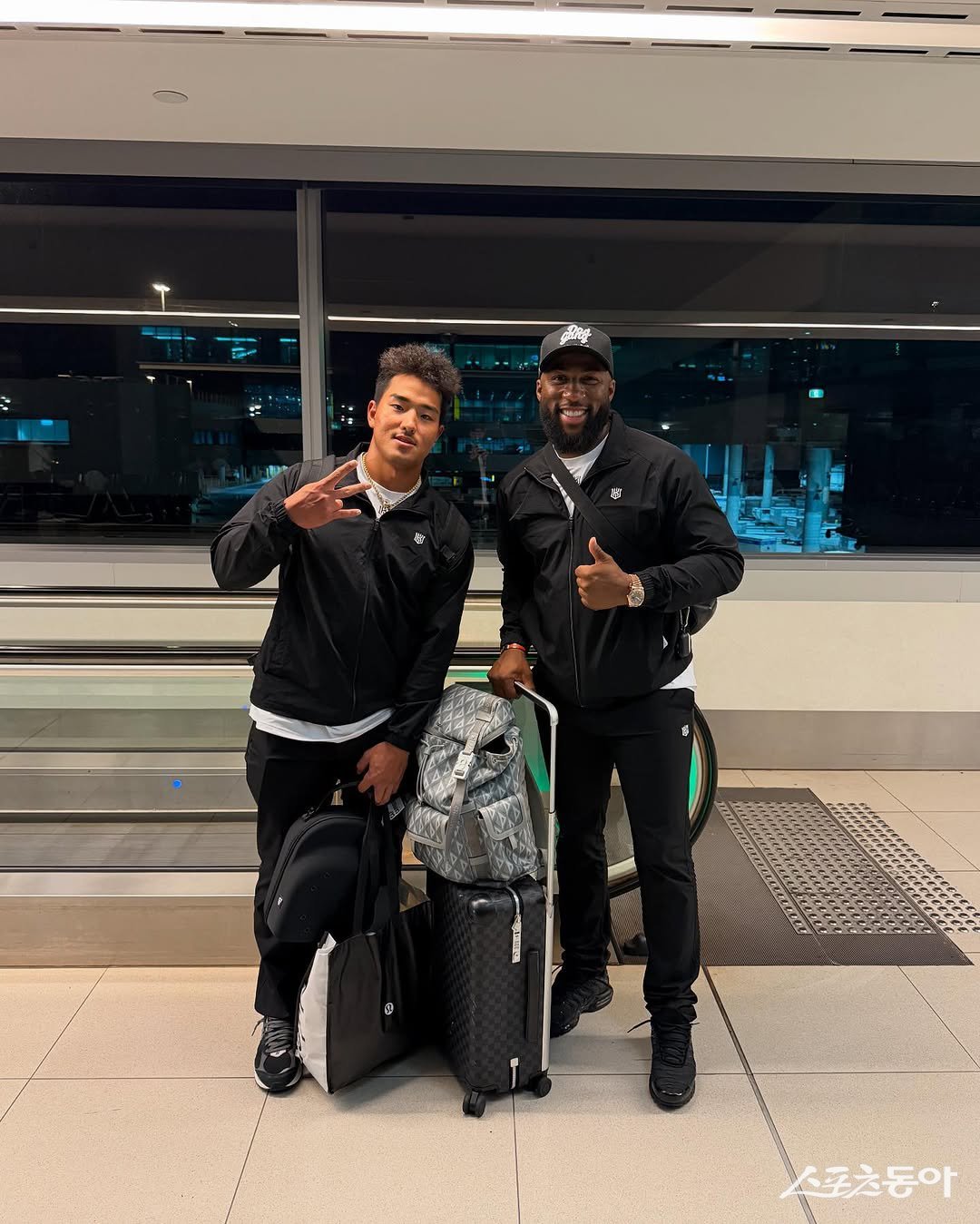 KT 안현민(왼쪽)과 멜 로하스 주니어가 2월 호주 질롱에서 1차 스프링캠프를 마친 뒤 멜버른공항에서 기념 사진을 촬영하고 있다. 사진출처|멜 로하스 주니어 인스타그램 캡처