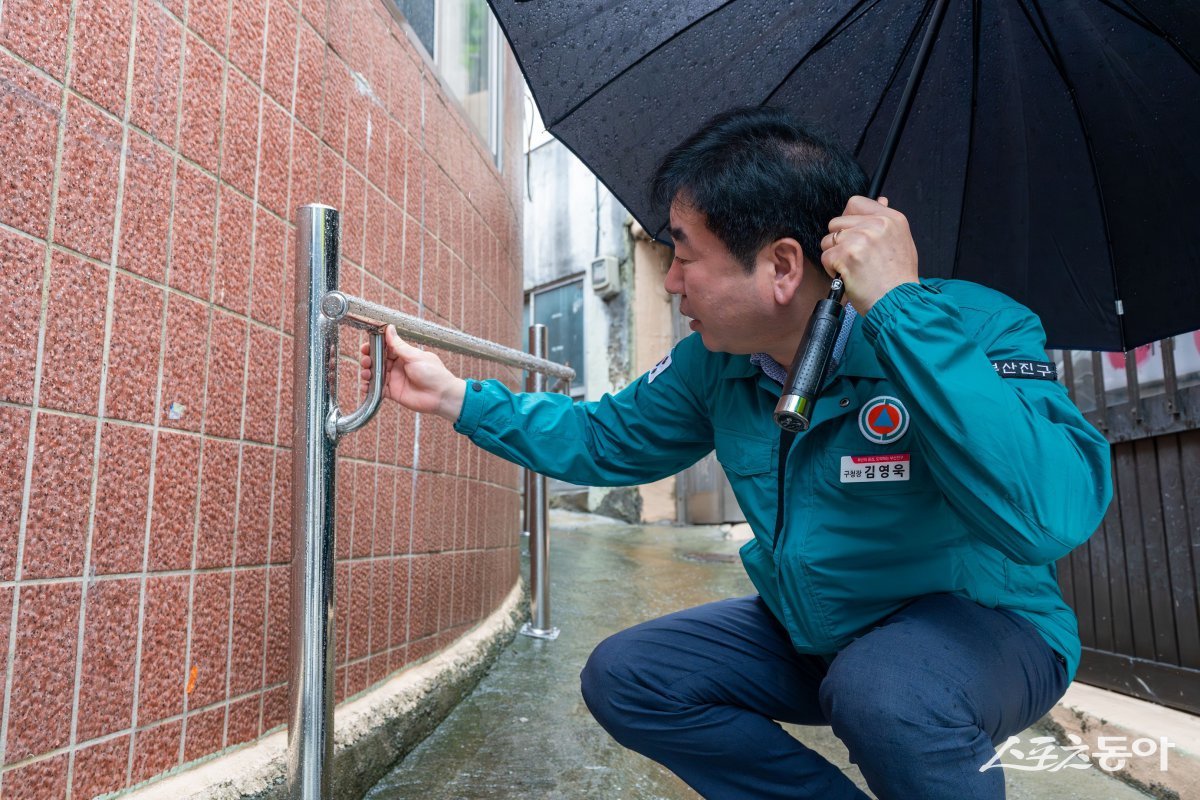 부산 부산진구가 안전하고 걷기 좋은 도심 보행환경을 조성하기 위해 2023년부터 지속적으로 추진해 온 ‘고지대 보행취약지 정비사업’을 완료한 가운데 김영욱 구청장이 난간을 점검하고 있다. (사진제공=부산진구)