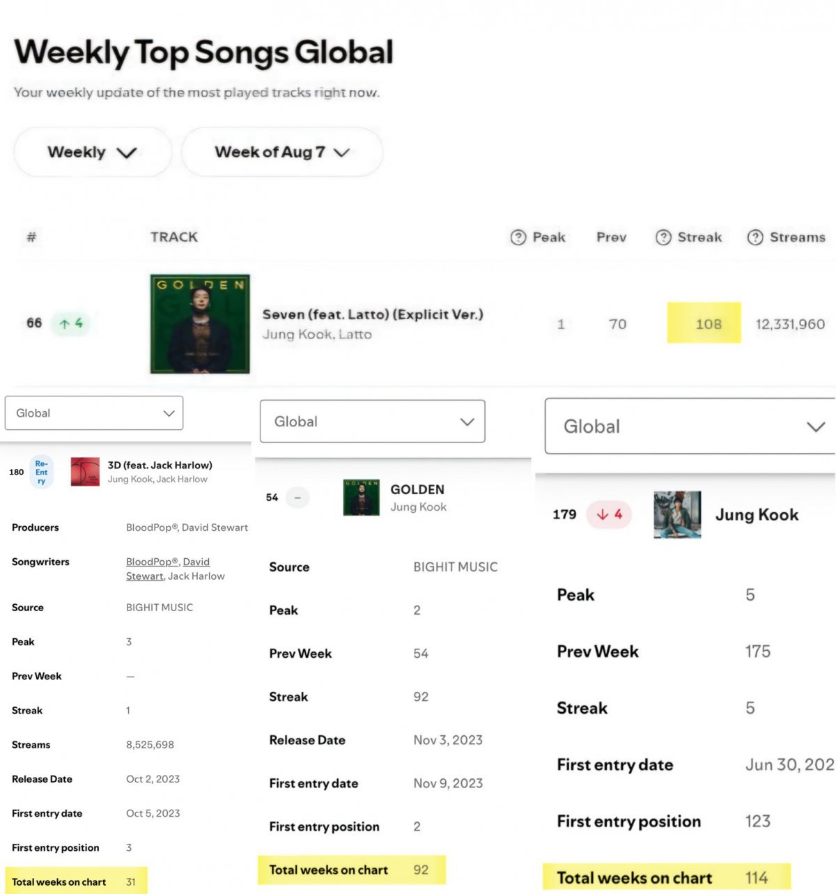 13일(한국시간) 기준, ‘Seven’은 24억 8700만 회, ‘GOLDEN’은 59억 회 스트리밍을 달성했다. 정국의 스포티파이 전체 스트리밍 수는 93억 회, 월간 청취자 수는 1750만 명대를 꾸준히 유지 중이다.
