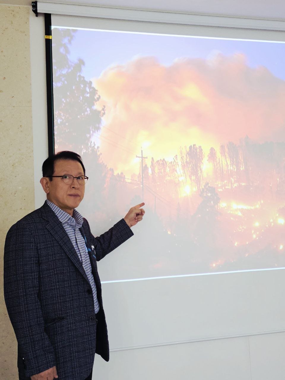 최학수 환경안전보건협회장이 최근 대형 산불에 대한 설명과 ‘카이툰시스템’ 착용의 중요성에 대해 설명하고 있다. 사진 ㅣ 정태기 기자