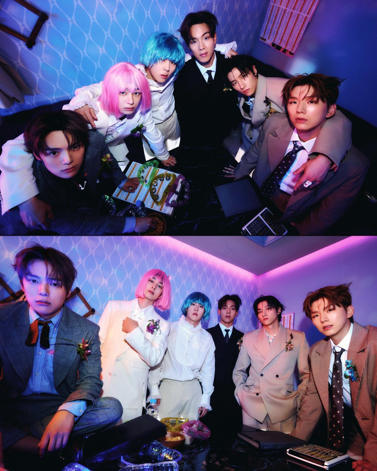 리본, 프릴 등 디테일이 인상적인 슈트핏으로 팬심을 설레게 한 몬스타엑스. 이들은 노래방 뒤풀이 콘셉트의 사진으로 유쾌한 반전 매력을 보여주도 했다. 실제 노래방에서 노는 모습을 연상케 하는 자연스러운 팀 케미스트리가 눈길을 끄는 바. 형원과 주헌은 각각 핑크, 블루 컬러의 가발을 착용해 웃음을 더했다.