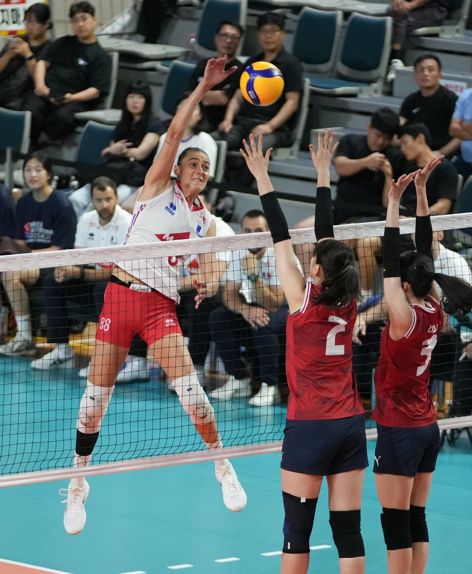페르난도 모랄레스 감독(푸에르토리코)이 이끄는 대표팀(세계랭킹 39위)이 13일 진주실내체육관에서 열린 ‘2025 코리아인비테이셔널 진주국제여자배구대회’ 2차전에서 프랑스(15위)에 세트스코어 2-3(8-25 25-18 21-25 25-23 7-15)으로 패했다. 1승1패를 기록한 한국은 15일 스웨덴(26위)과 대회 3차전을 치른다.