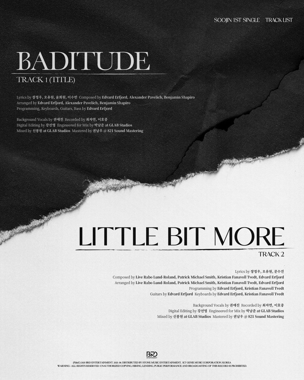 BRD엔터테인먼트는 13일 수진의 공식 SNS 채널에 싱글 ‘BADITUDE’의 트랙리스트 이미지를 공개했다. 트랙리스트에는 동명의 타이틀곡 ‘BADITUDE’와 수록곡 ‘Little Bit More’가 포함됐다.