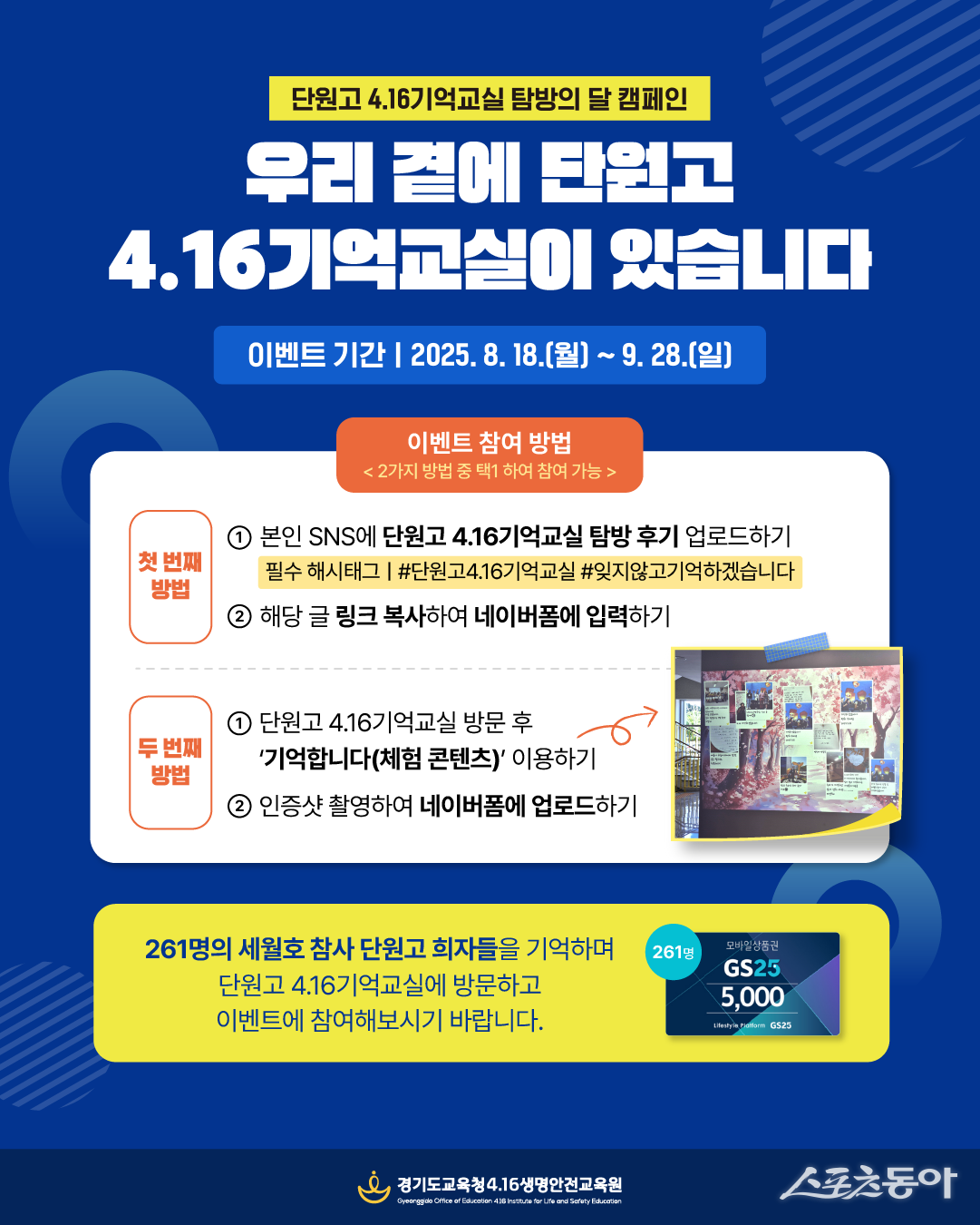 참가자는 경기도교육청4.16생명안전교육원 공식 인스타그램(https://www.instagram.com/goe_416/)을 구독해야 하며, 추첨을 통해 총 261명(세월호 참사로 희생된 단원고 희생자 수와 동일)에게 편의점 상품권이 증정된다.