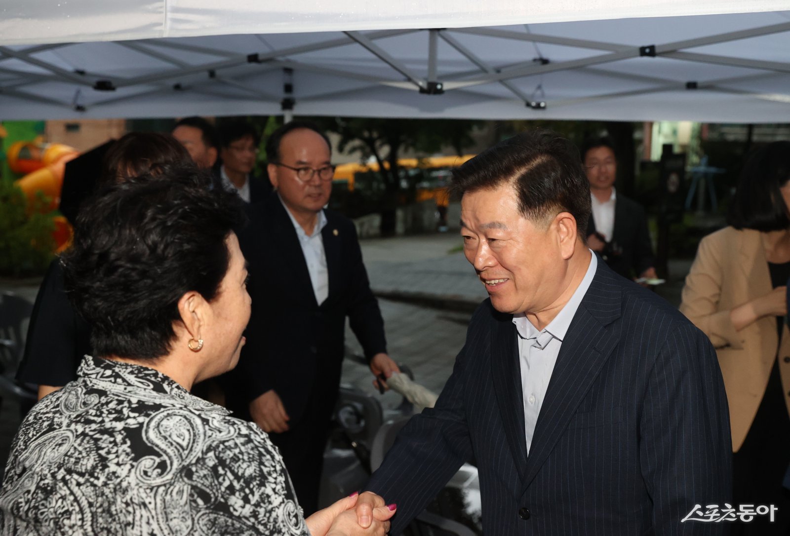 박승원 광명시장(사진 오른쪽)이 지난 13일 열린 소하2동 골목 경관 개선 사업 준공식에 참석해 지역 주민과 인사를 나누고 있다. 사진제공|광명시
