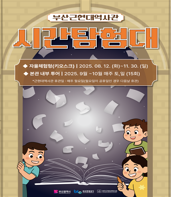 연출형 스토리텔링 투어 ‘시간탐험대’는 9월부터 매주 토요일과 일요일 진행된다. 역사적 장소에서 스토리텔러(캐릭텔러)와 함께 상황극 형식으로 펼쳐지며, 참가자는 부산근현대역사관 본관과 별관을 무대로 시대별 인물과 함께 시간여행을 즐길 수 있다. 몰입감 높은 현장 체험을 통해 과거의 부산을 생생하게 느낄 수 있다.