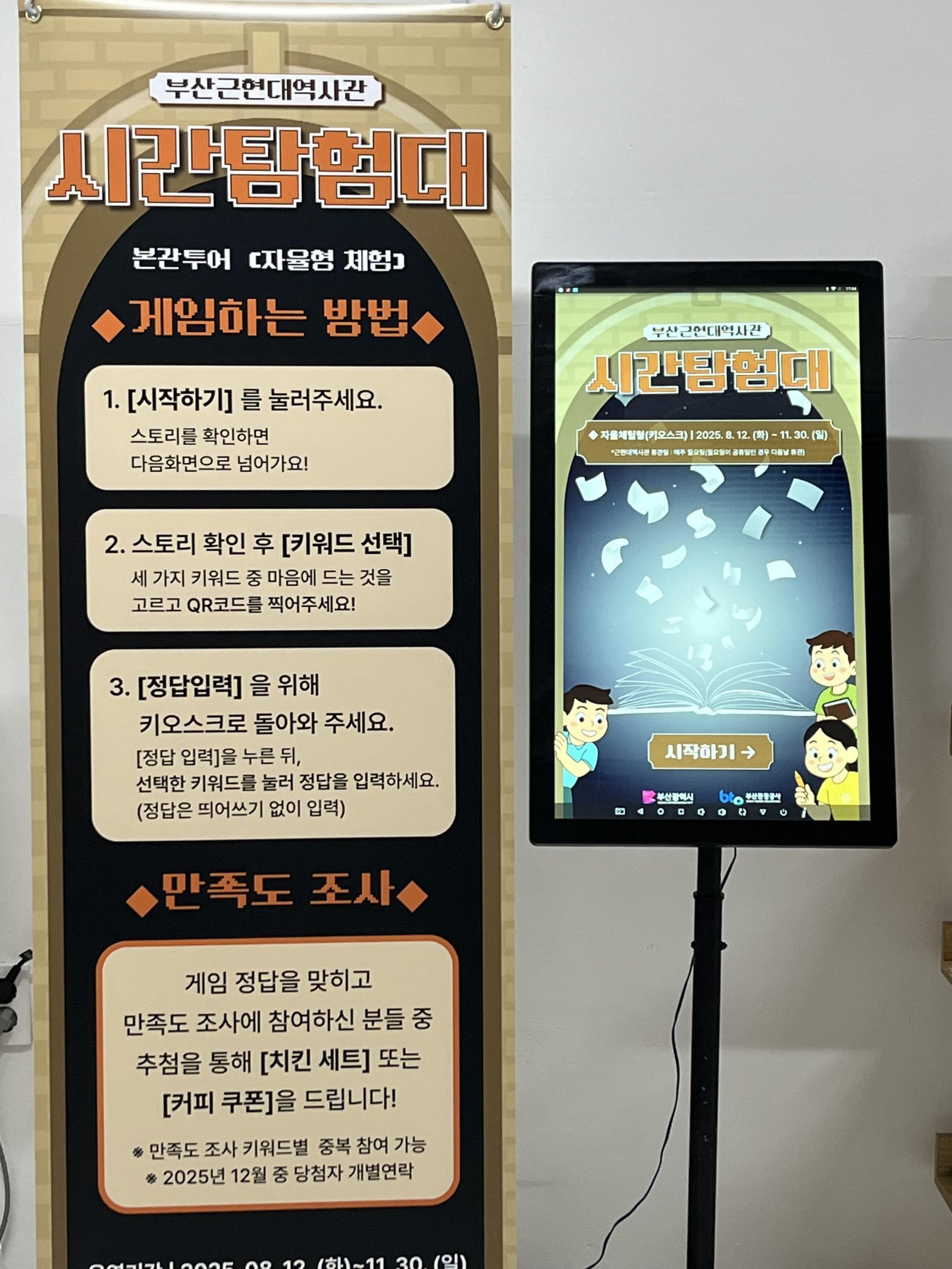 키오스크 기반 자율 체험형 프로그램은 코로나19 이후 주목받고 있는 비대면·비접촉 관람 방식을 적용했다. 전시를 탐험하며 키오스크에서 미션을 수행하고, 만족도 조사까지 마치면 추첨을 통해 커피 또는 치킨 쿠폰을 받을 수 있다. 8월 12일부터 11월 30일까지 부산근현대역사관 본관 1층 시민편의시설에서 상시 이용할 수 있으며, 매주 월요일은 휴관이다.