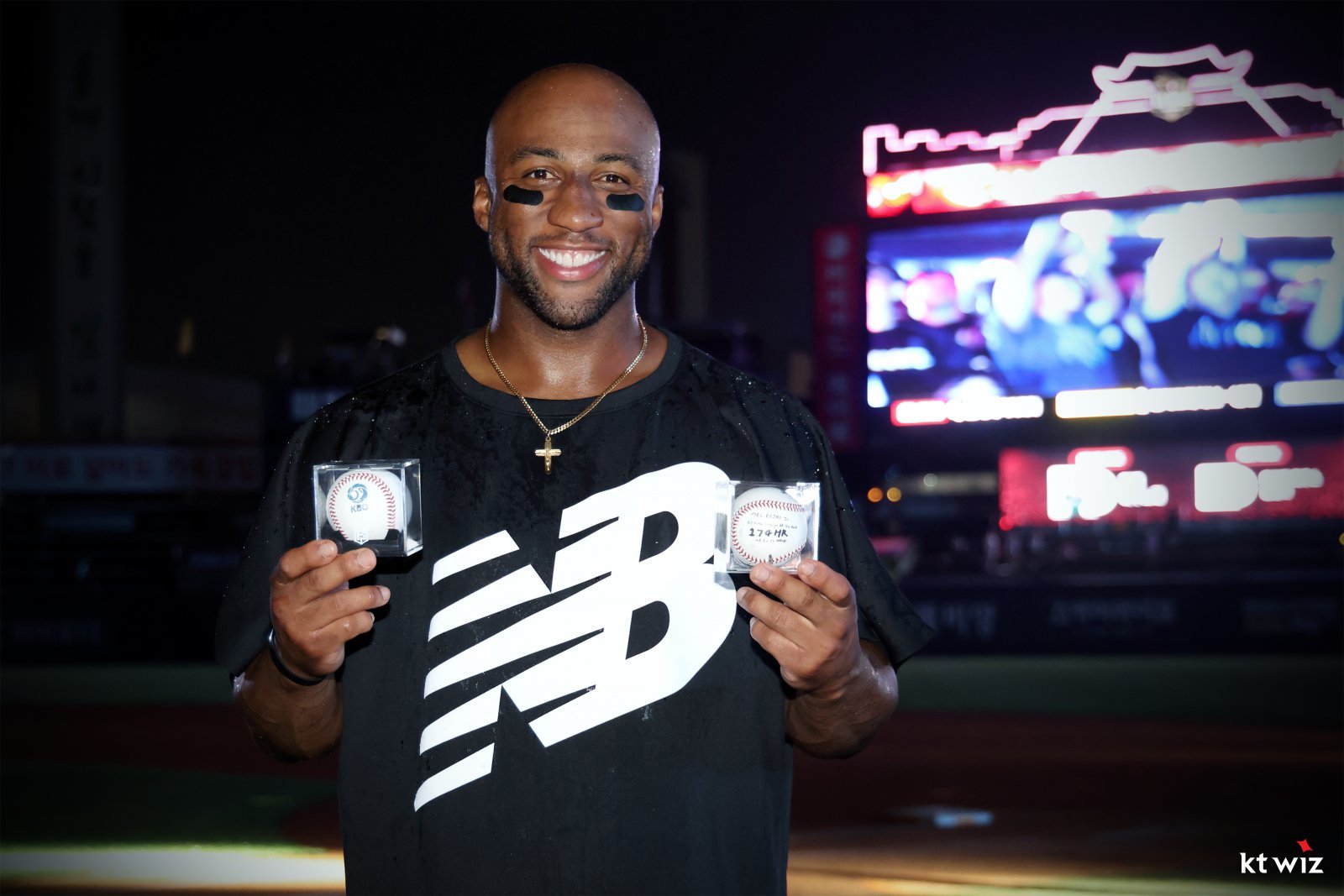 멜 로하스 주니어가 7월 3일 수원KT위즈파크에서 열린 키움과 홈경기에서 역대 외국인선수 통산 홈런 1위에 오른 뒤 기념구를 들고 사진을 촬영하고 있다. 사진제공|KT 위즈