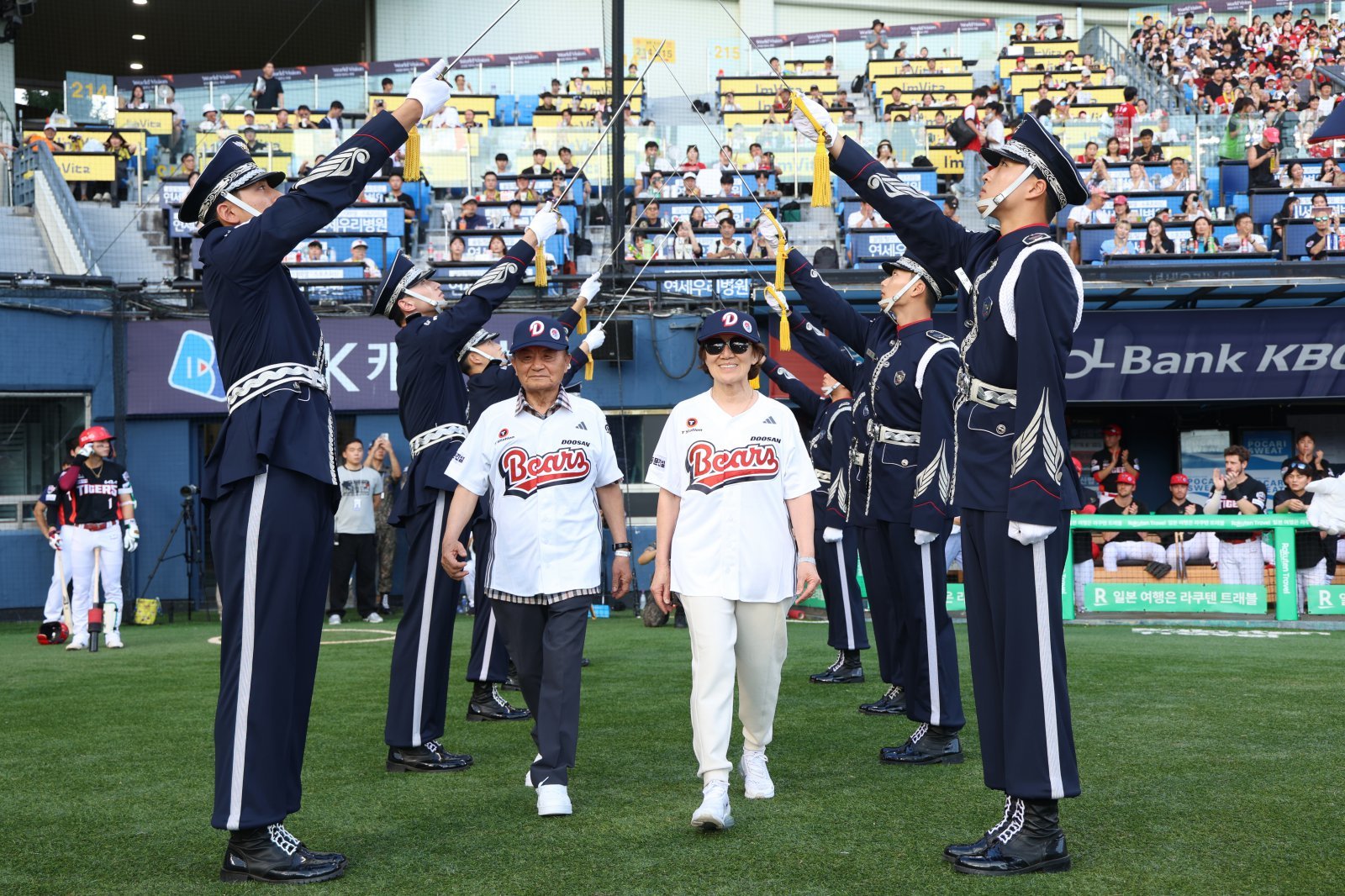 15일 KIA와 두산의 시즌 13차전이 열린 잠실구장에선 경기 시작 전 ‘광복 80년, 8.15 그날을 기억하며’ 행사가 진행됐다. 이날 경기 시구와 시타를 맡은 노영탁 독립운동가족 기념사업 대표(왼쪽)와 임인자 한국독립운동유산 대표가 공군의장대 도열을 지나 입장하고 있는 모습. 사진제공|두산 베어스
