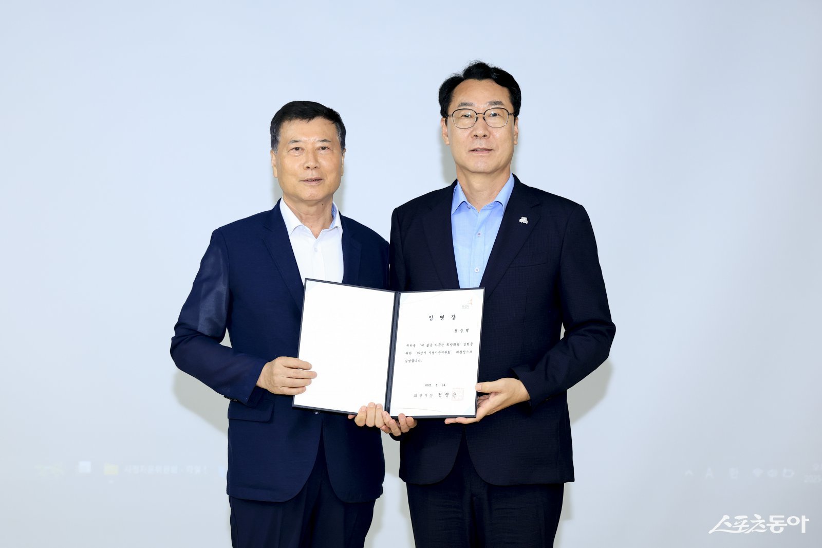 정명근 화성특례시장(사진 오른쪽)이 지난 14일 정승렬 화성시 시정자문위원회 위원장에게 임명장을 수여하고 기념촬영하고 있다. 사진제공|화성시