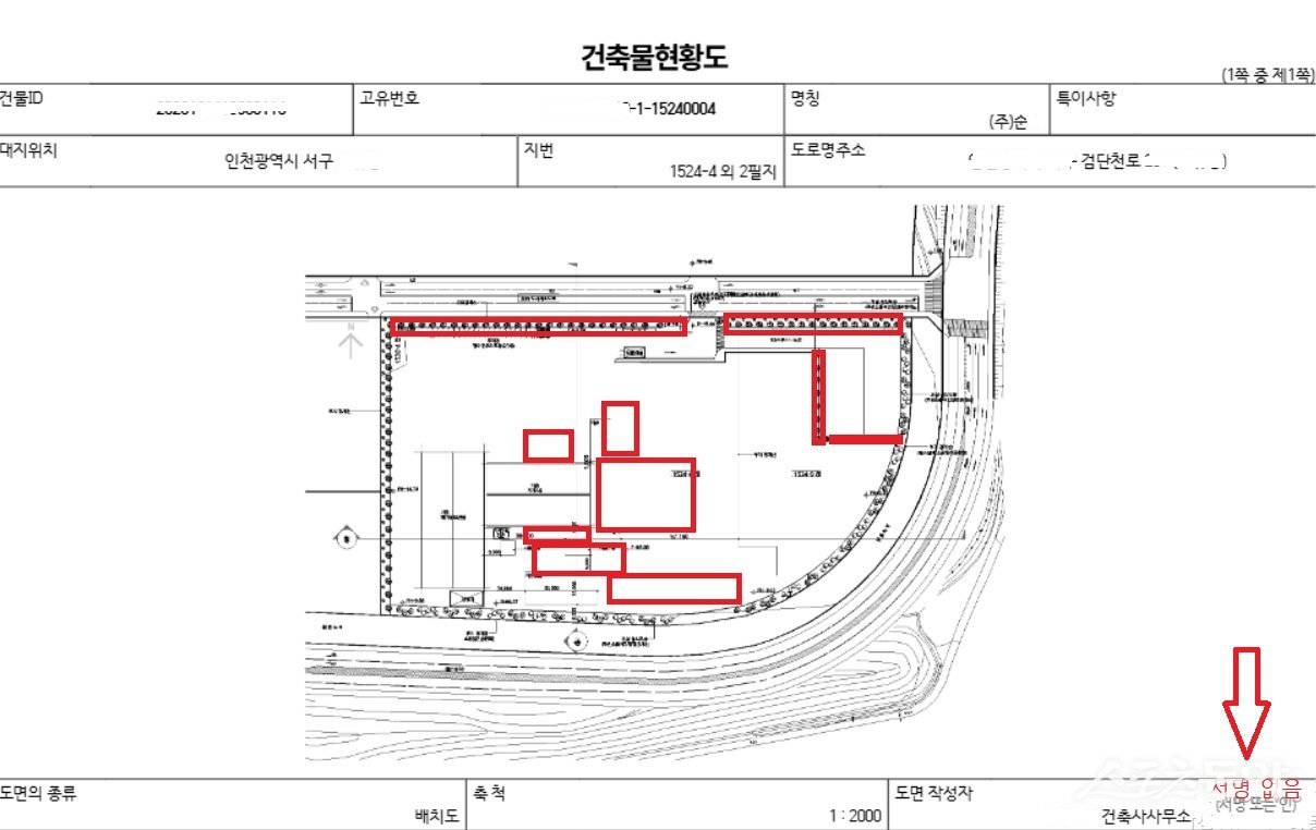 인천광역시 서구 오류동 1524-4번지 외 2필지에 위치한 S업체(건축물 현황도). 사진제공|공익 제보자