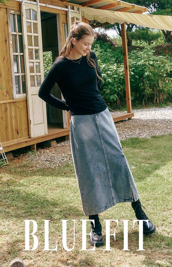 블루핏의 대표 아이템은 데님 스커트(사진)로, 깔끔한 H라인과 은은한 빈티지 워싱으로 세련된 실루엣을 완성한다. 또 리브 티셔츠는 7부 소매와 프리미엄 소재를 사용해 편안하면서도 고급스러운 착용감을 선사한다.