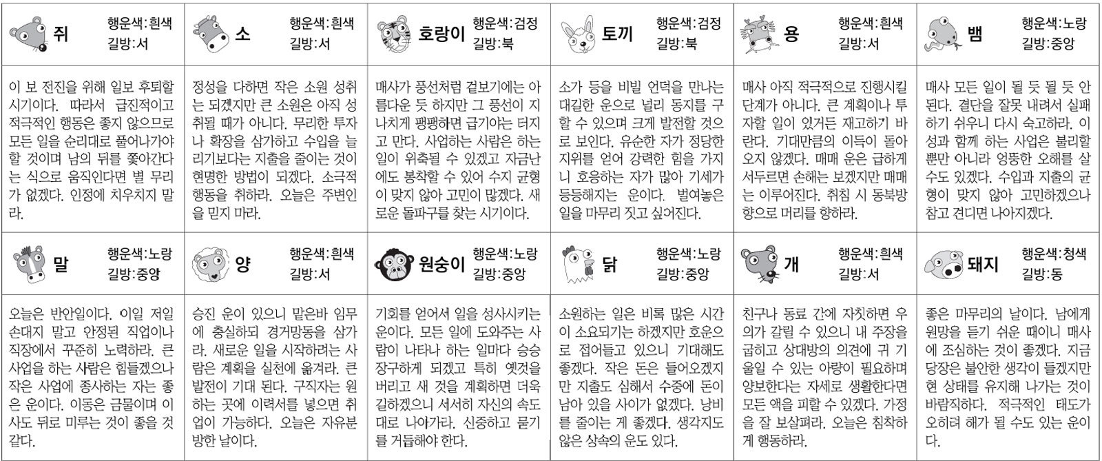 돼지띠 : 좋은마무리의날이다.남에게원망을듣기쉬운때이니매사에조심하는것이좋겠다.지금당장은불안한생각이들겠지만현상태를유지해나가는것이바람직하다.적극적인태도가오히려해가될수도있는운이다.