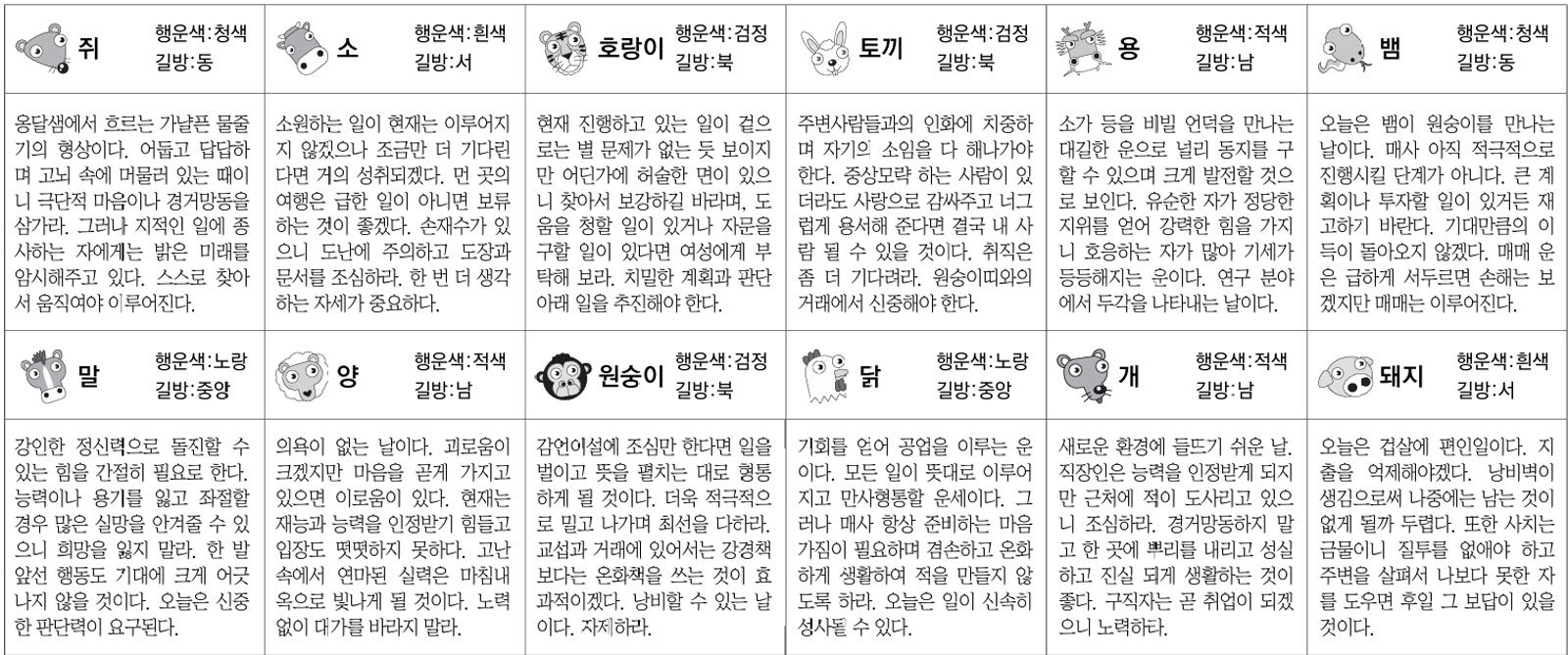 개띠: 새로운환경에들뜨기쉬운날.직장인은능력을인정받게되지만근처에적이도사리고있으니조심하라.경거망동하지말고한곳에뿌리를내리고성실하고진실되게생활하는것이좋다.구직자는곧취업이되겠으니노력하라.