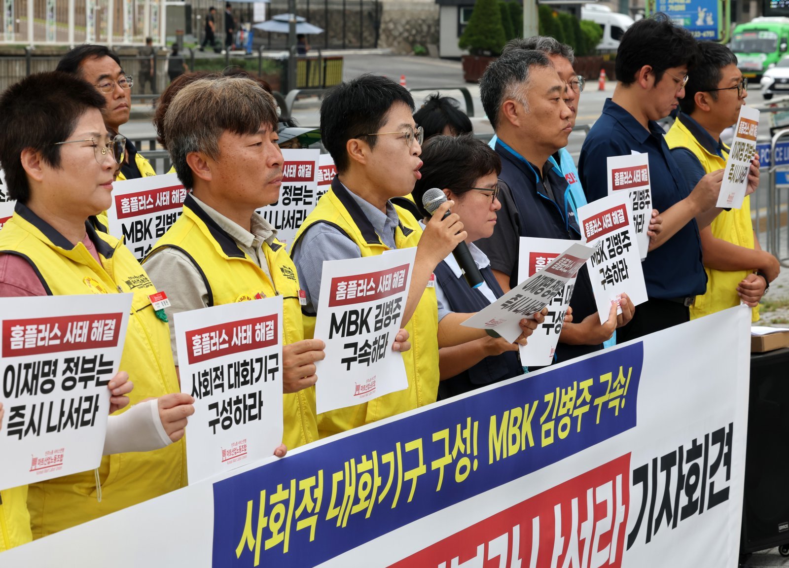 그는 “MBK는 기업 체질을 개선하고 미래를 준비해야 할 책임은 외면한 채 단기 이익만 추구하며 알짜 자산을 팔아치고 만 명이 넘는 노동자를 해고했다”며 “최근에는 무려 15개 점포의 폐점을 발표해서 노동자와 입점 업주들의 생존권을 벼랑 끝으로 내몰고 있다”고 설명했다.