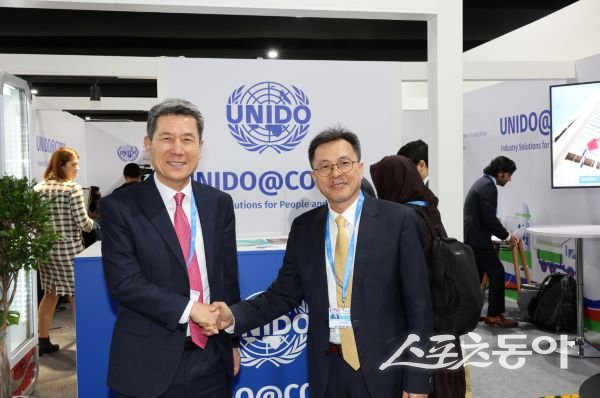 지난해 11월 아제르바이잔 바쿠에서 개최된 ‘제29차 유엔기후변화협약 당사국총회(COP29)’ 참석해 포항을 유니도에 소개하고 있는 모습. (좌)이강덕 포항시장, (우)츠용 조우 유니도 부국장. 사진제공ㅣ포항시