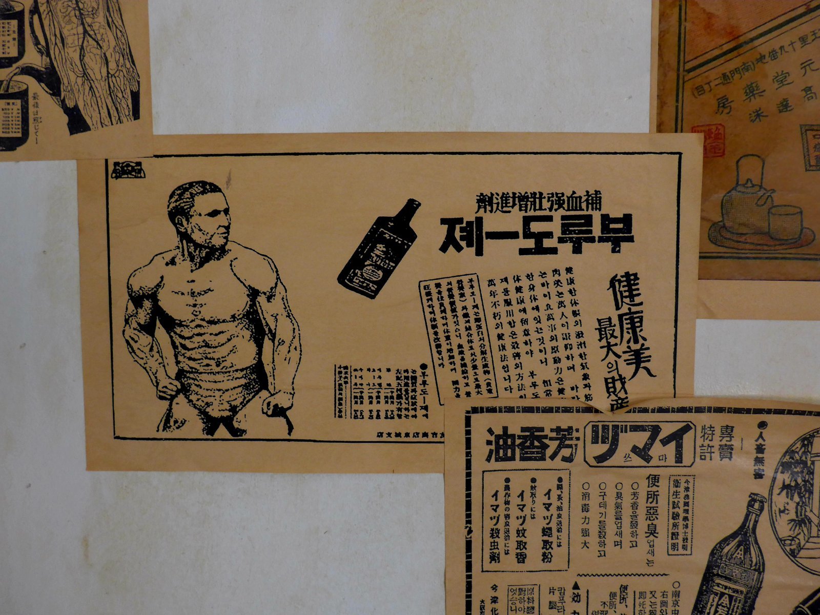 ‘쓰리지안코 압흐지안함(쓰리지 않고 아프지않음). 로-도 안약’, ‘마치온이라로으녁저츰아(아침저녁으로 라이온치약)’, ‘건강미 최대의 재산 부루도-졔(불도저)’, ‘만병통치가 되야 수명을 2배로 만드는 생명원소가 발견되엇다(당시에도 과대 허위광고가 있었던 모양이다)’.