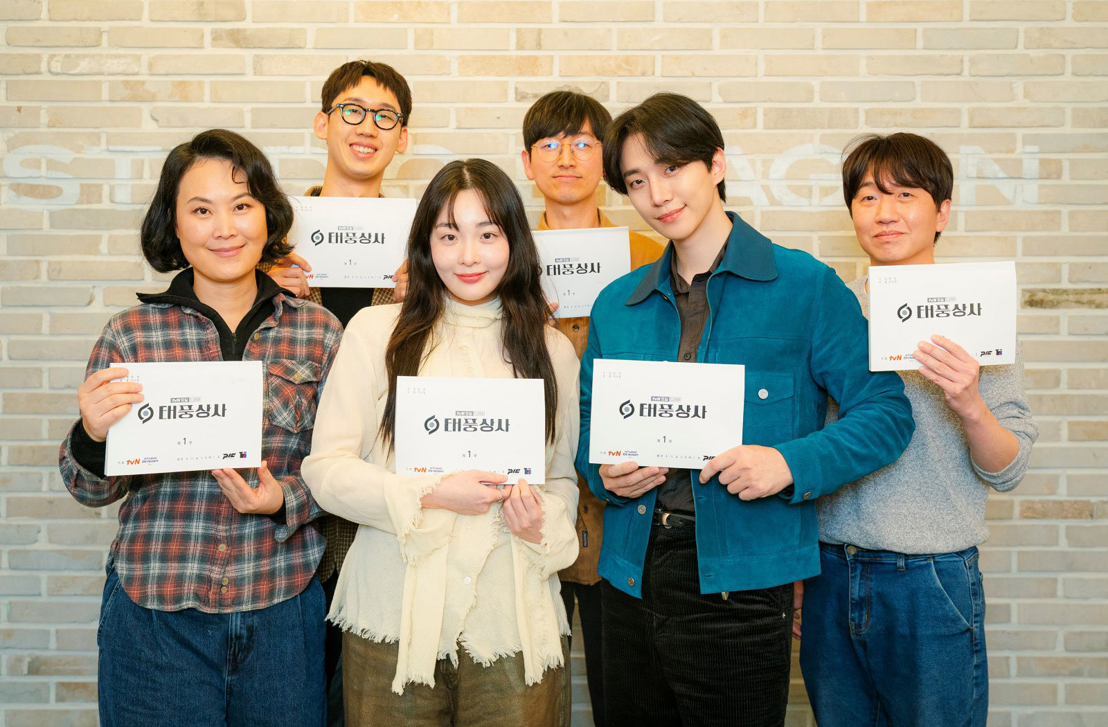 ‘태풍상사’(연출 이나정, 극본 장현, 기획 스튜디오드래곤, 제작 이매지너스·스튜디오 PIC·트리스튜디오)의 대본리딩 현장에는 이나정 감독, 장현 작가를 필두로 이준호, 김민하, 김민석, 권한솔, 이창훈, 김재화, 김송일, 이상진, 김지영, 김상호, 무진성, 김영옥, 박성연, 권은성, 그리고 특별출연으로 극 초반의 몰입감을 책임질 성동일까지 총출동해 자리를 빛냈다.