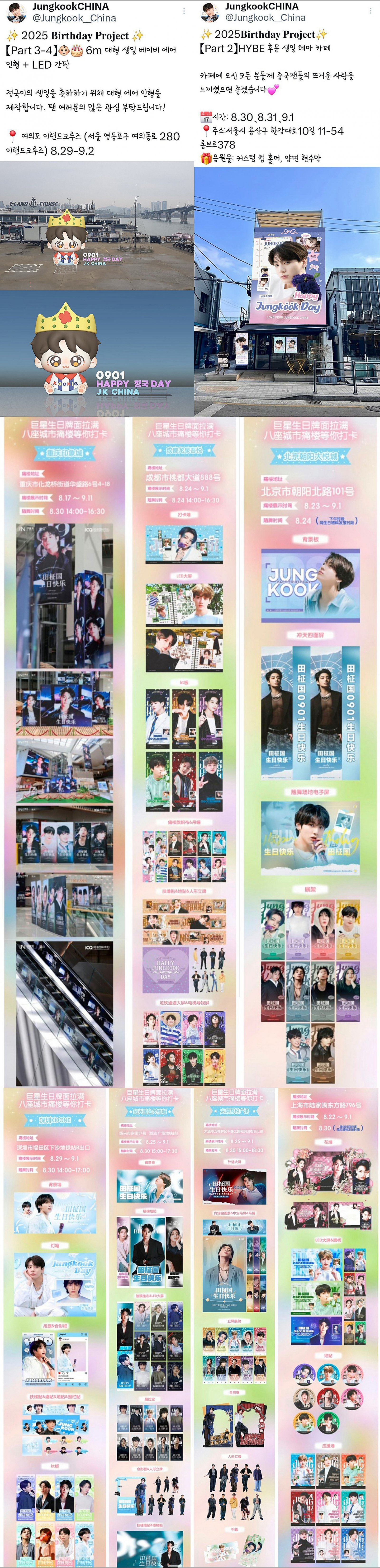 그뿐만이 아니다. 이번 서포트는 국경을 가볍게 넘었다. 상하이, 베이징, 충칭, 항저우, 타이완, 청두, 선전, 소흥 등 무려 8개 도시 랜드마크에서 정국존 전시 이벤트가 동시에 열린다. 스크린 광고, 조형물, 포토존, 배너, 에스컬레이터 래핑까지, 도시 전체가 정국의 얼굴로 덮일 예정이다.