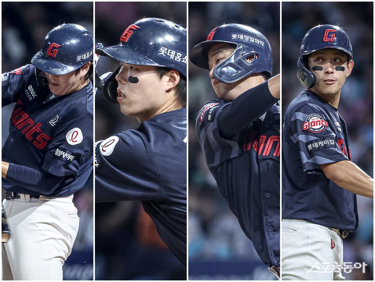 2017년 이후 8년 만의 가을야구 진출을 노리는 롯데에는 지난해 주축 선수로 발돋움한 나승엽, 고승민, 손호영, 황성빈(왼쪽부터)과 퓨처스(2군)리그에서 재정비 중인 간판 윤동희의 활약이 중요하다. 사진제공|롯데 자이언츠