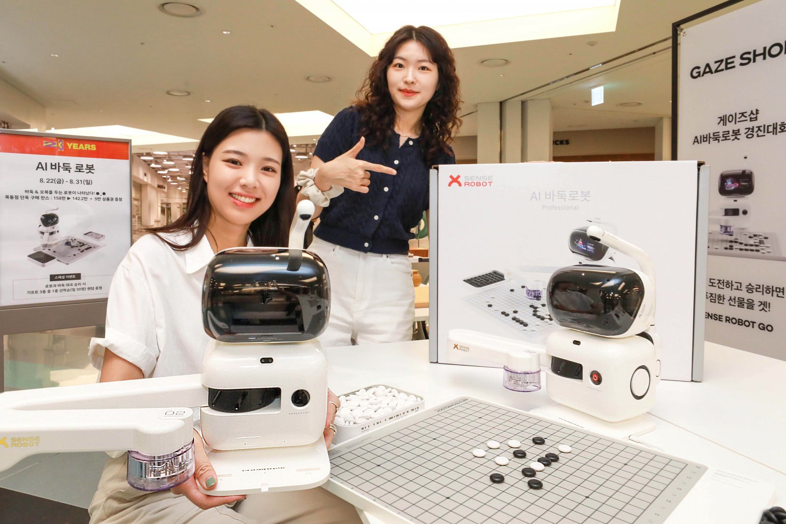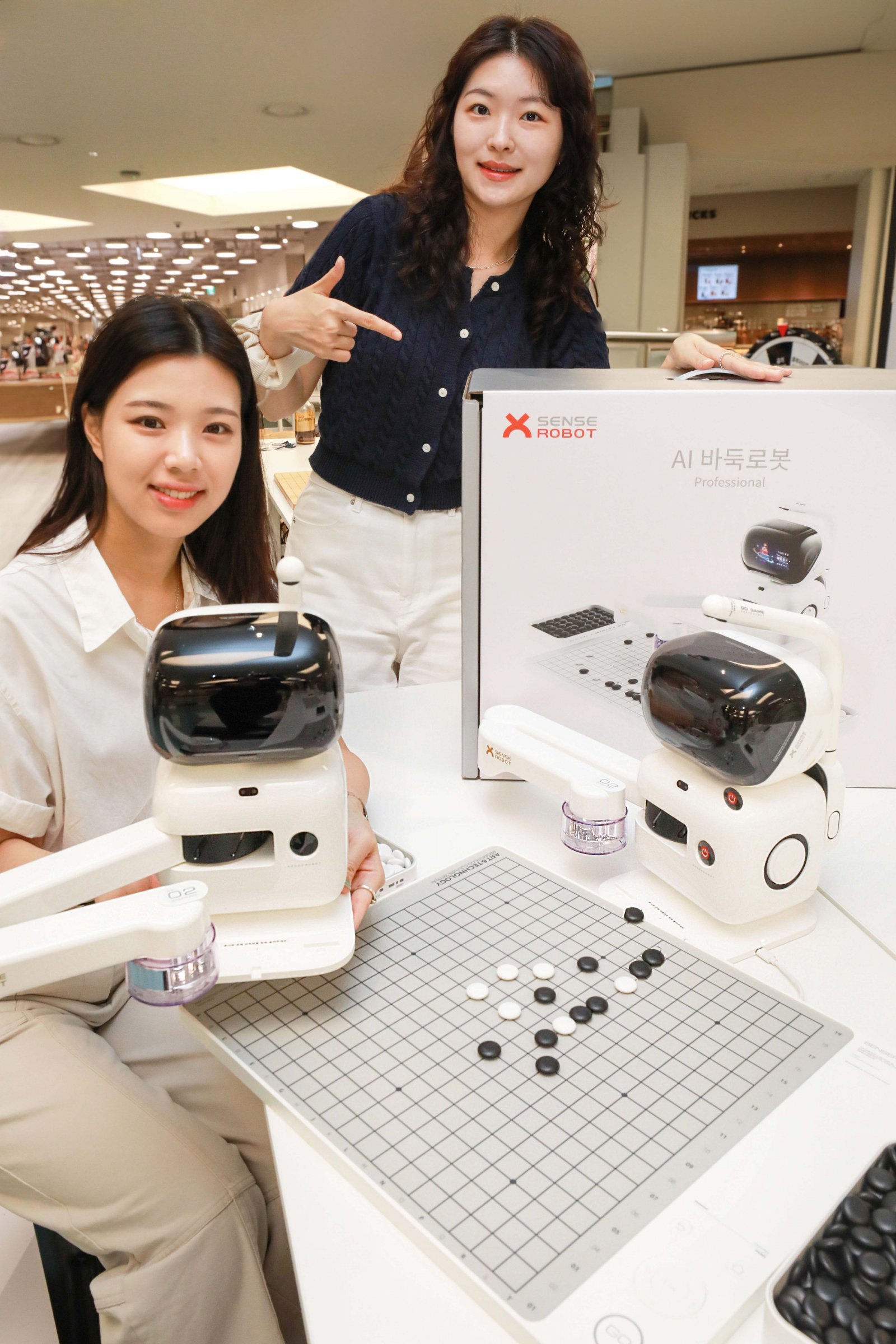 현대백화점 목동점이 31일까지 지하2층 센트럴커넥션에서 인공지능(AI) 개발 업체 센스타임이 개발한 AI 바둑 로봇 ‘센스로봇 고’ 팝업스토어를 운영한다. 바둑은 18급부터 프로 9단까지, 오목은 7단계까지 난이도 조정이 가능하며, 로봇 팔을 이용해 실제 바둑판에서 대국을 즐길 수 있다. 판매 가격은 142만2000원. 바둑 체험에서 승리한 고객에게 블루라이트 차단 안경, 미니 공공 청정기, 무선 충전 트레이 등을 준다. 사진제공|현대백화점