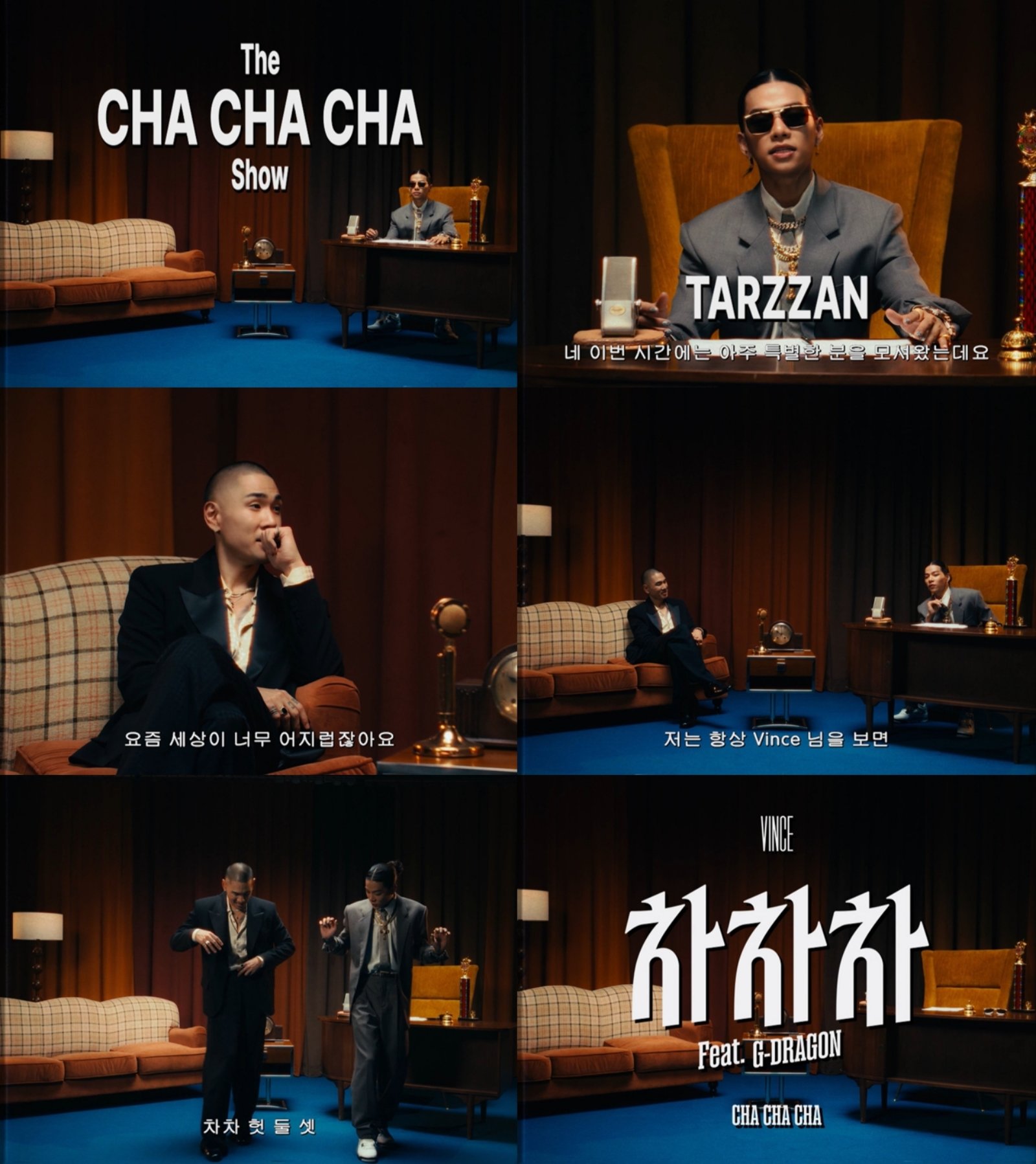 영상에 등장한 타잔은 토크 쇼 진행자로 변신, 약 1년 9개월 만에 신곡으로 컴백한 빈스와 새 디지털 싱글 ‘차차차(CHA CHA CHA)’를 소개했다. 프로듀서와 아티스트의 관계이자, 동료 아티스트이기도 한 두 사람의 유쾌한 케미스트리가 이목을 집중시켰다.