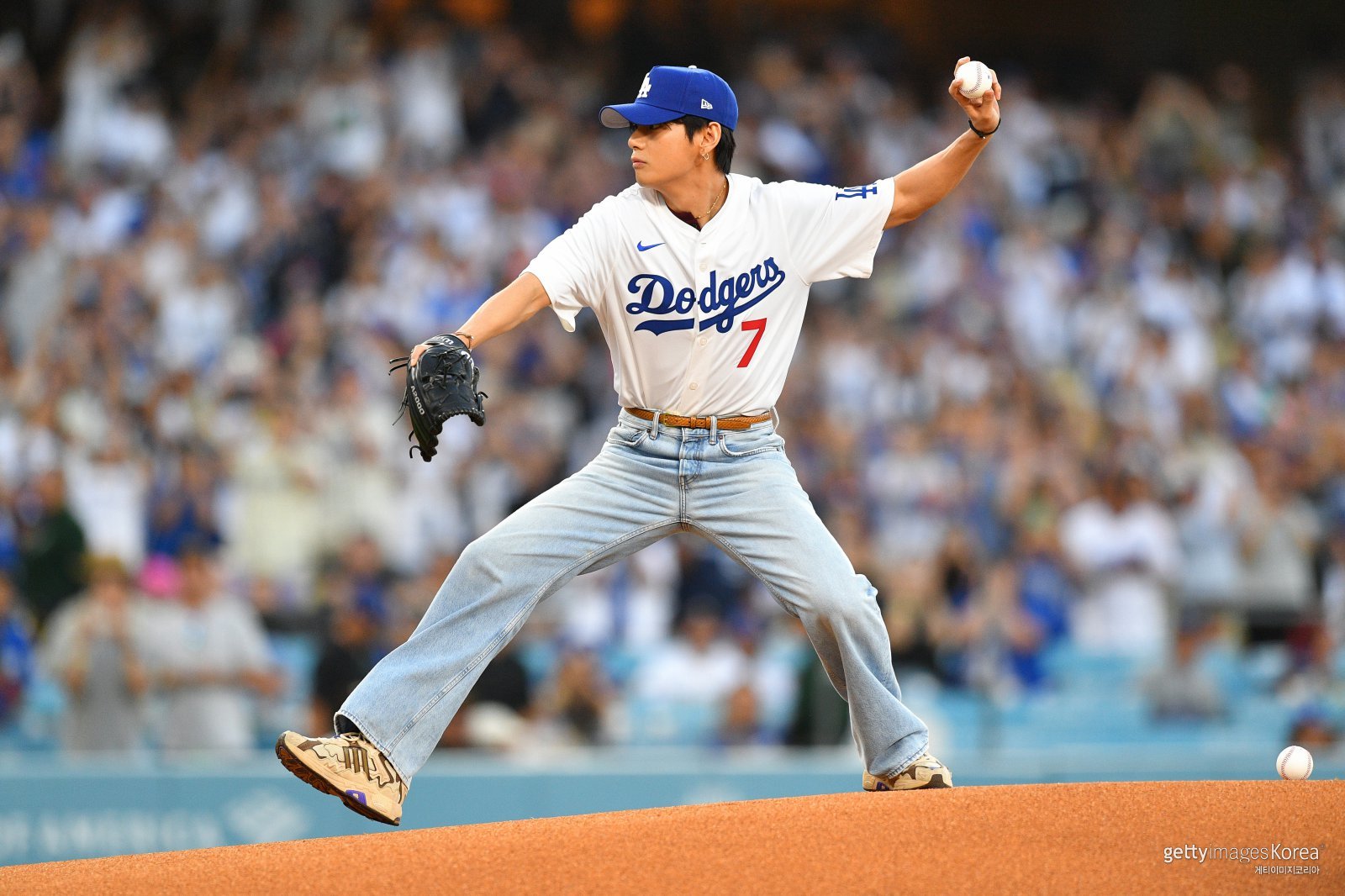 2장 방탄소년단 뷔(김태형)가 25일 캘리포니아주 로스앤젤레스 다저스타디움에서 열린 로스앤젤레스 다저스와 신시내티 레즈의 경기를 앞두고 시구를 하고 있다.