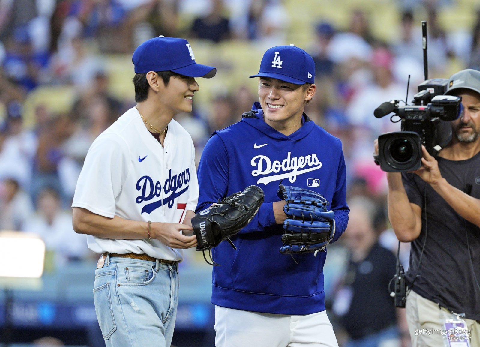 방탄소년단 뷔(김태형)가 25일 로스앤젤레스 다저스타디움에서 열린 다저스와 신시내티 레즈의 야구 시구를 앞두고 각각 투수와 포수로 활약하는 로스앤젤레스 다저스의 야마모토 요시노부와 이야기를 나누고 있다.
