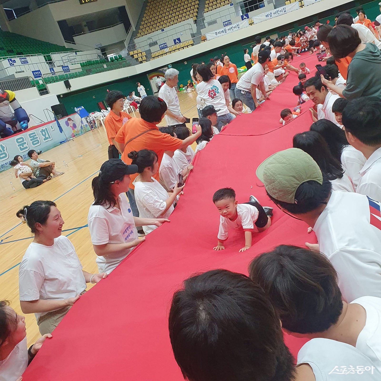 지난해 8월 30일 성남실내체육관에서 열린 제1회 성남시 아장아장 운동회 때 날아라 병아리(긴 천을 부모가 양쪽에서 잡고 아이들이 위로 건너가는 경기) 사진제공ㅣ성남시