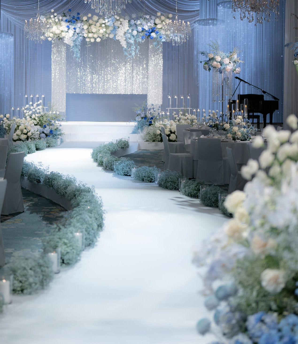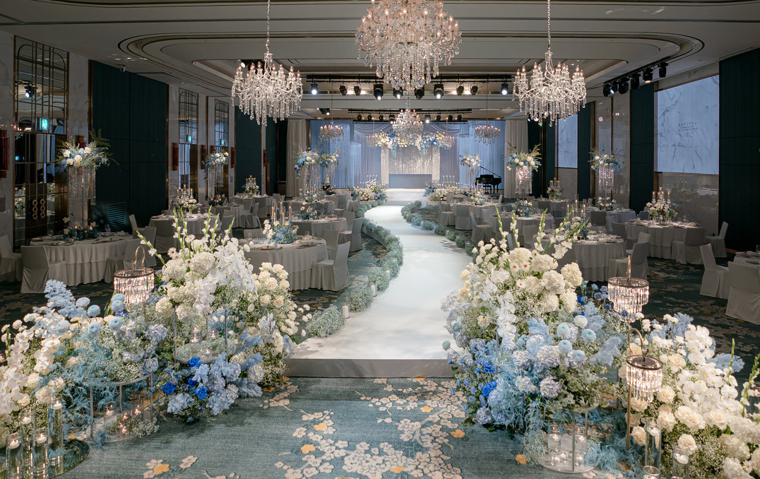 ‘레끌라 블루’는 프랑스 인상파 거장 클로드 모네의 작품 세계에서 영감을 받은 콘셉트다. 모네가 빛과 계절의 변화를 담아낸 섬세한 색채처럼, 단 한 번뿐인 결혼식을 가장 눈부신 순간으로 표현했다. 특히 호텔 개관 4주년을 기념해 프랑스에서 결혼 4주년을 상징하는 보석 ‘블루 토파즈’를 모티브로 삼아 블루와 실버 컬러를 메인 테마로 꾸몄다. 곡선형 버진로드와 크리스털 비즈 장식 무대, 수국을 중심으로 한 플라워 데코레이션은 모네의 작품을 옮겨놓은 듯한 우아함을 선사했다.