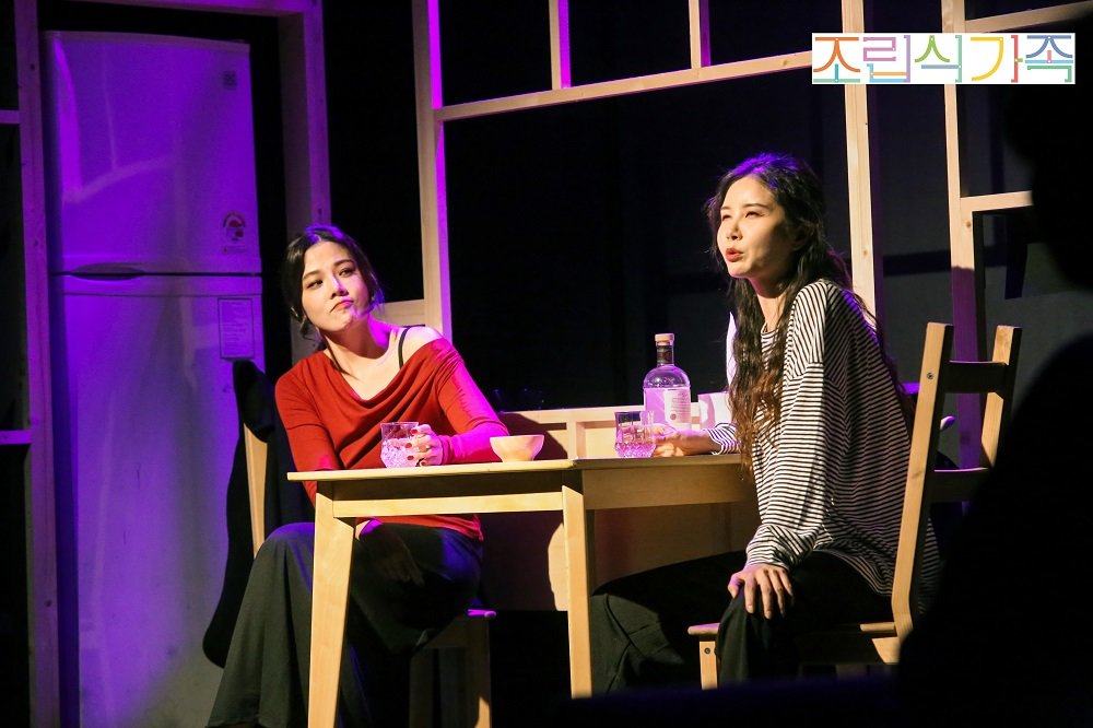 연극 ‘조립식 가족’의 한 장면. 보육원 출신 청년인 희정(김해나 분·오른쪽)과 오갈 데 없어 정식 집에서 얹혀 살고 있는 정미(윤신주 분)는 함께 술을 마시고 속 깊은 이야기를 털어놓으며 점차 가까워져 간다. (창크리에이티브 제공)