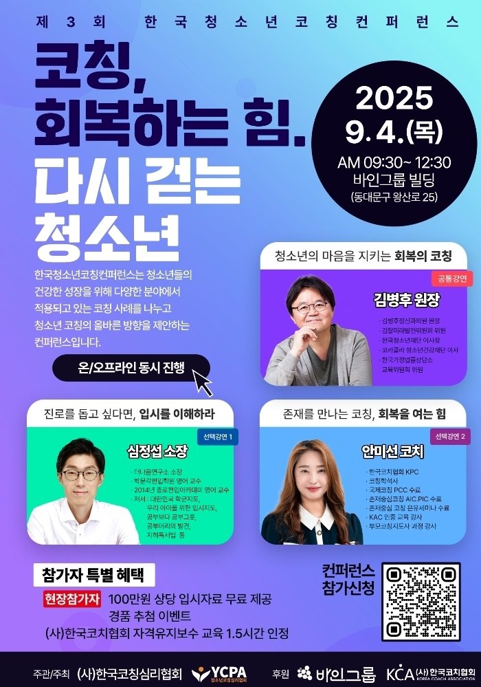 바인그룹(회장 김영철)이 후원하고 (사)한국코칭심리협회가 주최하는 제3회 한국청소년코칭컨퍼런스가 9월 4일 바인그룹 본사에서 열린다. 이번 행사는 ‘코칭, 회복하는 힘. 다시 걷는 청소년’을 주제로 청소년들의 정서적 어려움과 진로·존재 문제를 조명한다.