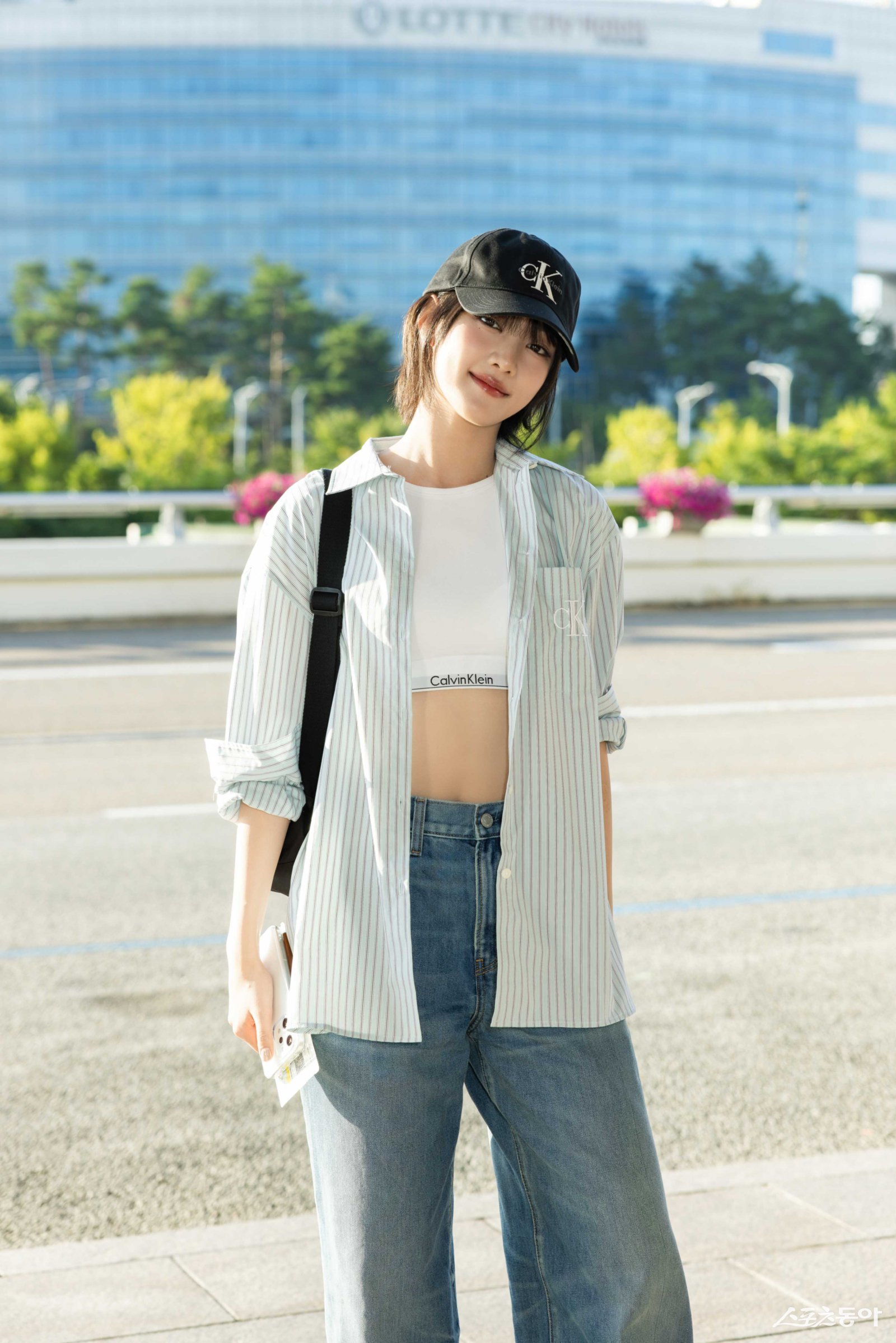 민니가 선택한 ‘공항 패션’은 미드 블루 와이드핏 데님과 함께 화이트 컬러의 티셔츠 브라, 코튼 셔츠를 매칭해 여유로운 무드를 완성했다. 여기에 포인트로 블랙 컬러의 모자로 포인트를 줬다.