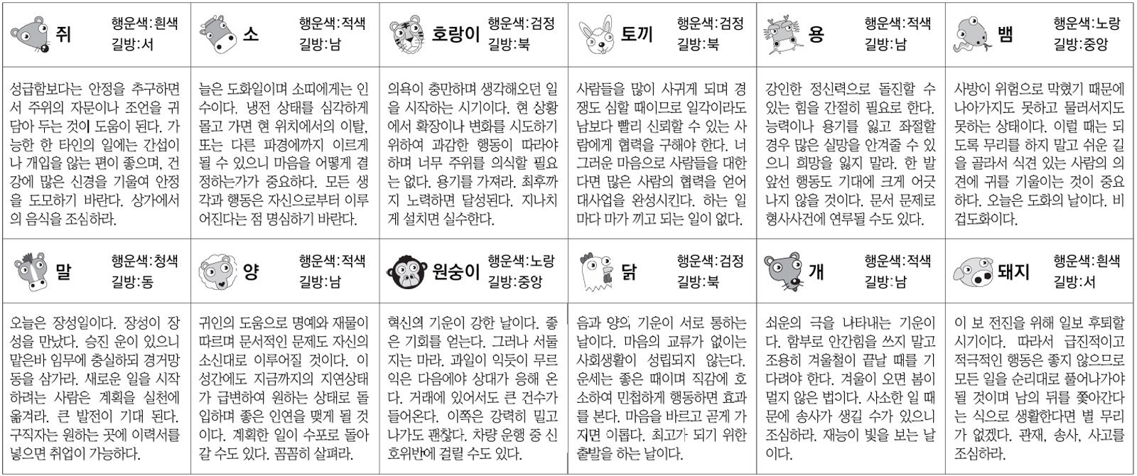용띠 : 강인한정신력으로돌진할수있는힘을간절히필요로한다.능력이나용기를잃고좌절할경우많은실망을안겨줄수있으니희망을잃지말라.한발앞선행동도기대에크게어긋나지않을것이다.문서문제로형사사건에연루될수도있다.