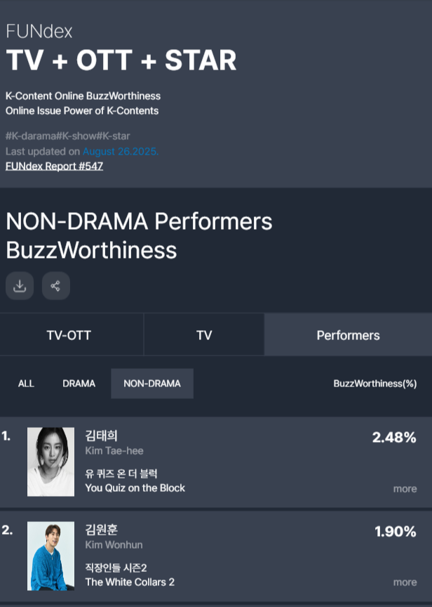 29일 굿데이터코퍼레이션 펀덱스(FUNdex)에서 발표에 따르면 김태희는 8월 3주차 TV·OTT 통합 비드라마 비드라마 출연자 화제성 부문에서 정상을 차지했다.