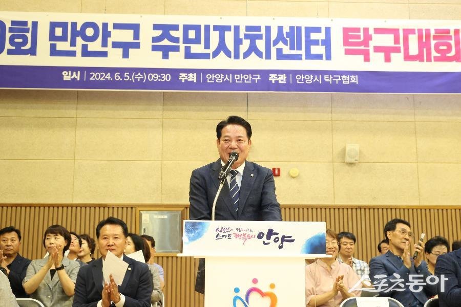 최대호 안양시장이 지난 2024년 만안구 주민자치센터 탁구대회에서 선수들을 격려했다. 사진제공|안양시