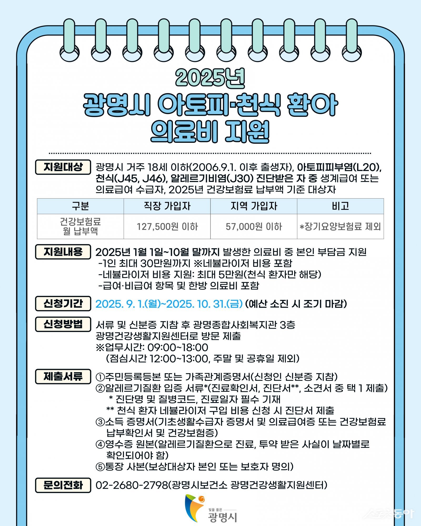 광명시(시장 박승원)는 오는 9월 1일부터 10월 31일까지 ‘아토피·천식 등 알레르기질환 의료비 지원사업’ 신청을 받는다(의료비 지원 안내문). 사진제공|광명시
