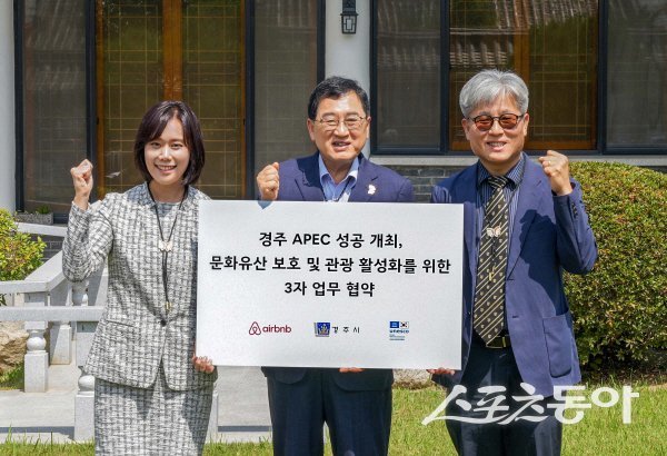 주낙영 경주시장(가운데)이 윤병순 유네스코한국위원회 사무총장 직무대행, 서가연 에어비앤비 코리아 컨트리매니저와 3자 협약을 체결하고 있다. 사진제공 ㅣ 경주시
