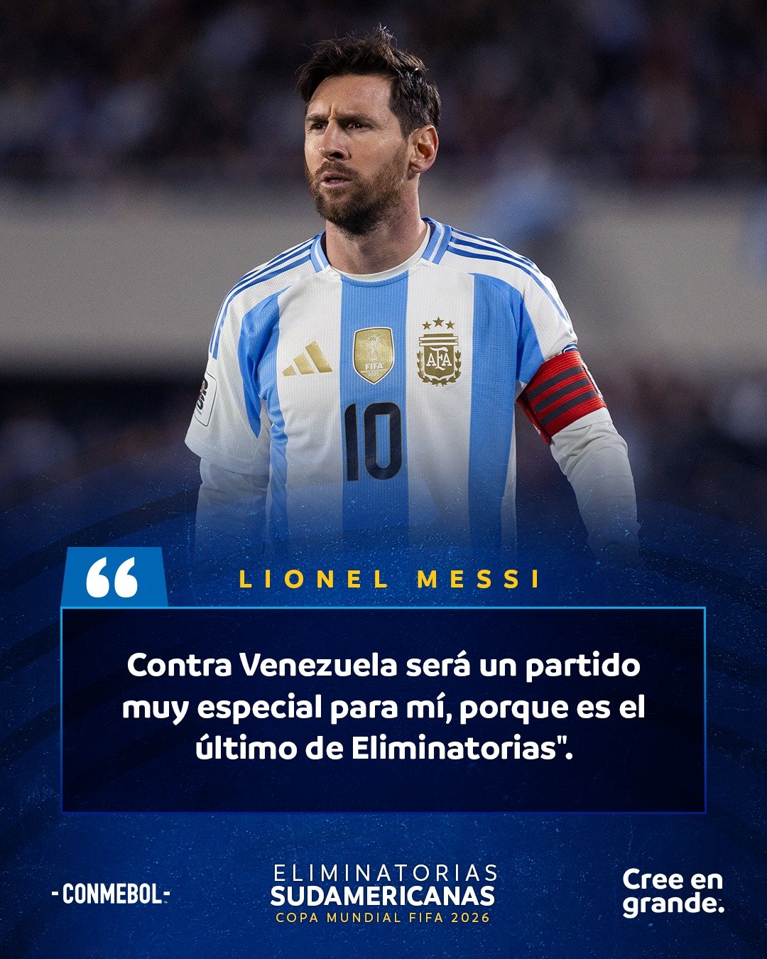 이에 메시는 베네수엘라전이 자신과 아내, 자녀, 부모, 형제 모두에게 뜻 깊을 것이라며 의미를 부여했다. 그는 “베네수엘라전 이후 홈에서 친선경기가 열릴지는 모르겠다. 무슨 일이 벌어질지는 모르겠지만, 확실한 것은 베네수엘라전은 나뿐만 아니라 내 가족들에게도 영원히 기억에 남을 경기일 것이다”고 밝혔다.